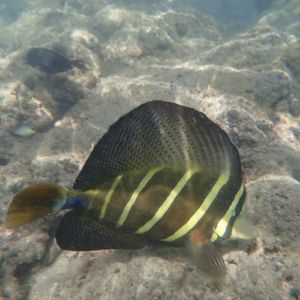 海はきれいです。魚はいっぱいいます。足ひれは慣れてないと扱いにくいです。岩とかでケガしやすいので、手袋、足ひれ使わないならビーチ用シューズなどあったほうがいいと思います。日焼け必発です。木陰は少ないです。魚がそこまで好きじゃなければ、半日で満喫できます。