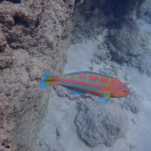 魚や珊瑚が見れるポイントが何ヵ所かあり見れる場所では30匹ぐらいの魚たちが戯れていたり、青や黄色の70センチくらいの魚が泳いでいました。