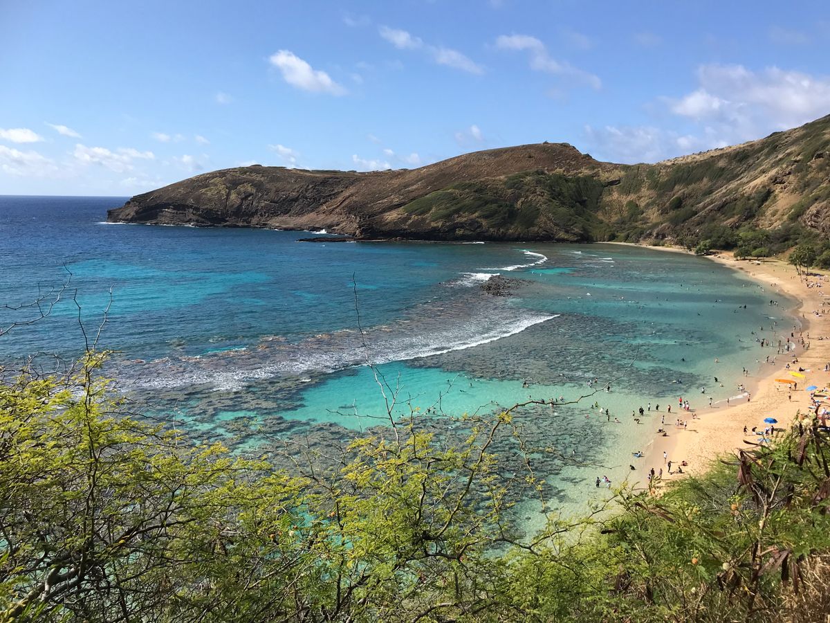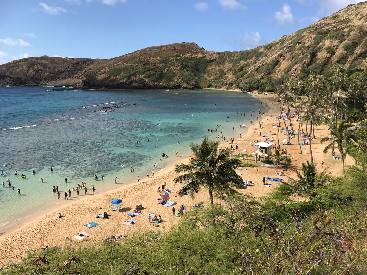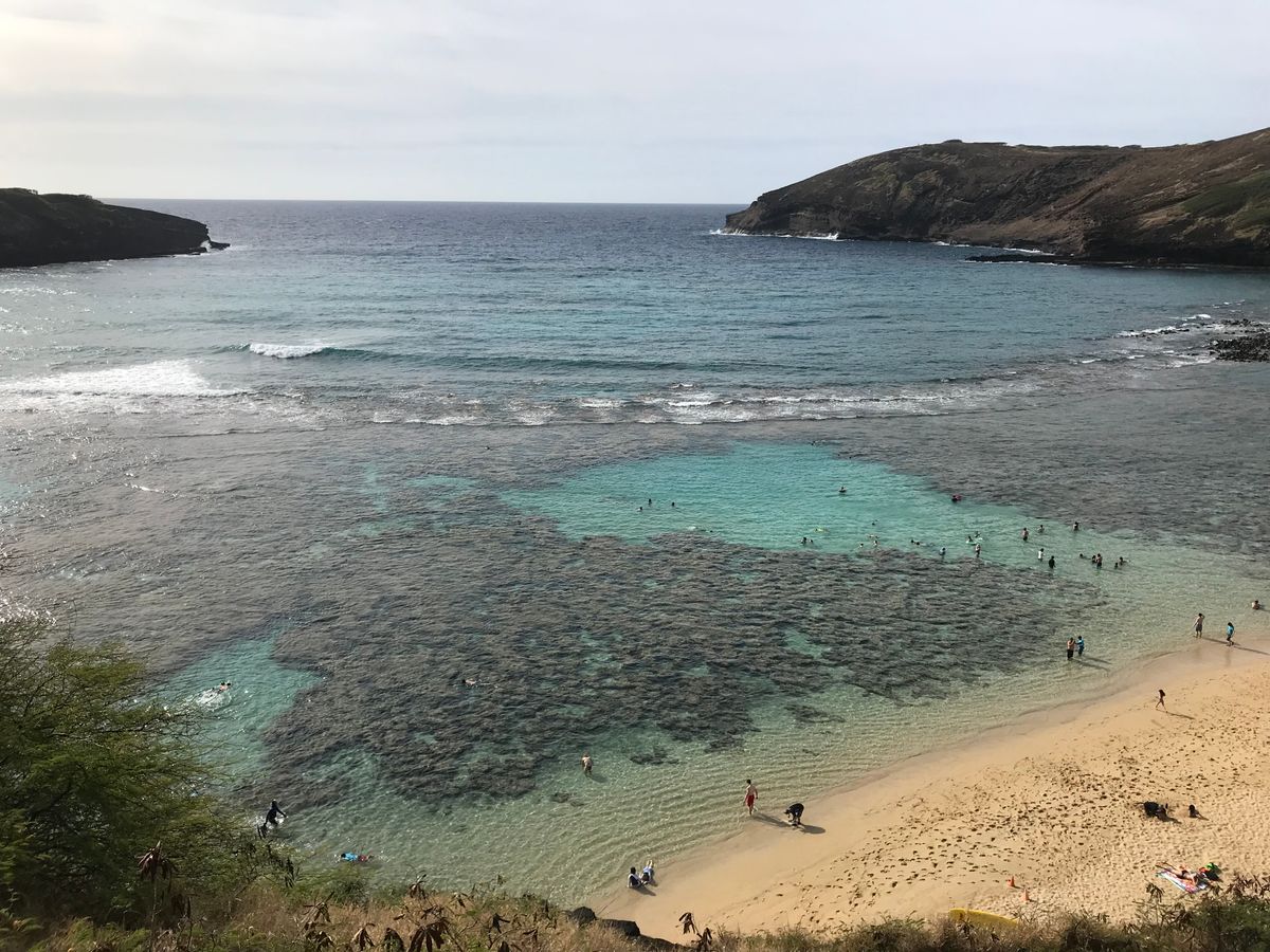 昼過ぎから別の予定があったので、昼にワイキキに戻れるこのツアーに参加しました(戻る時間は当日選べるので、ゆっくり滞在することもできます)。ドライバーは外国の方です。車内で契約書を渡され、サインをしました。ツアー事務所に着くと日本人スタッフの方がいて、シュノーケルセットやゴザを受け取り、説明を受けます。そして車に乗り、ハナウマ湾近くの駐車場で降りて、歩いてハナウマ湾へ。早速シュノーケルをしようとしたけど、3月の朝で気温がそれほど高くなく、海水が冷たくて海に入れず。子どもたちも寒いと言ってすぐ海から上がってしまいました。寒かったですがウェットスーツを着ている人はほぼいませんでした。仕方ないので浜でのんびり過ごし、気温が上がるのを待ちました。昼前になり少し暖かくなったので、海へ。大きな魚がいました。魚は期待していたよりは少なかったです。レンタルしたマスクはすぐ曇ってきたので、曇り止めを付けて欲しいと思いました。シュノーケル満喫とまではいきませんでしたが、家族でハナウマ湾に行けて満足です。スタッフの方、お世話になりありがとうございました。