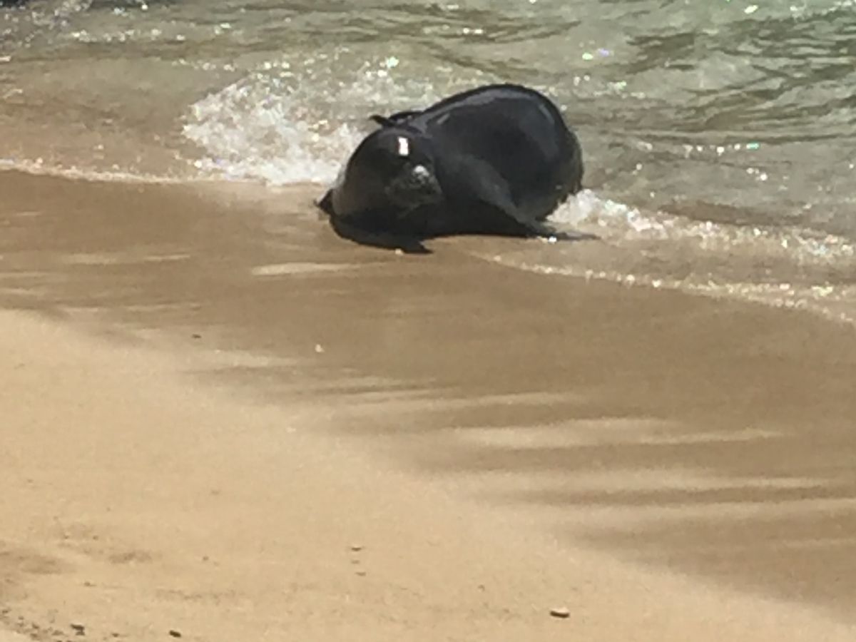 この日の午前のツアーに参加のお客様はとてもラッキーで、ハワイアンモンクシール(アザラシ)がビーチでお昼寝をしていたり、ウミガメにも会えたりしましたね!!