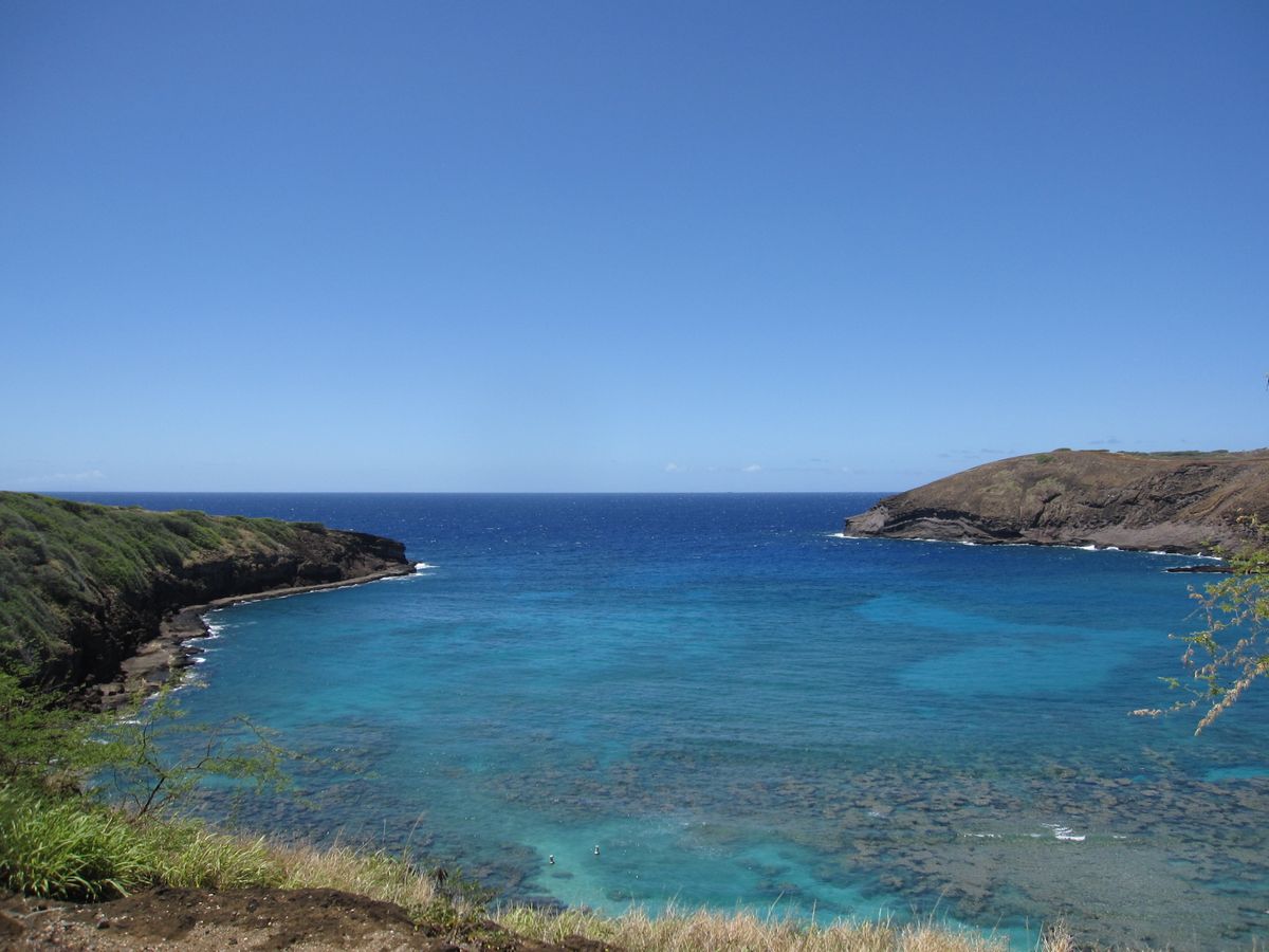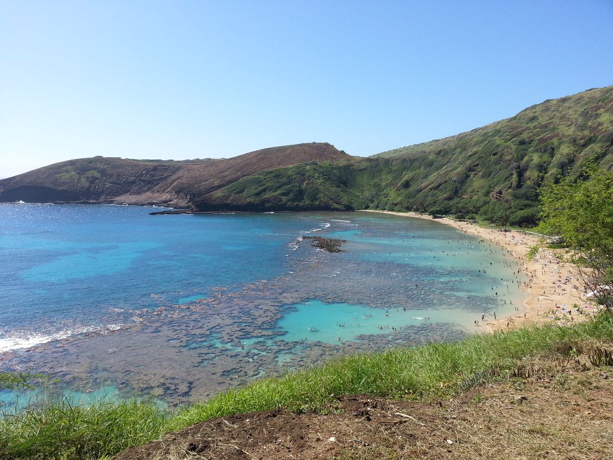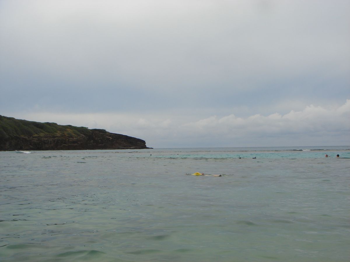 ハナウマ湾の円形の海岸でシュノーケリングをしました。ここは東ホノルルの南東端にあり、この美しい入り江がかつて火山のクレーターであったことを想像できます。今日、このクレーターは波の浸食によっておそらく水没し、重要な自然保護区と島で最も人気のあるシュノーケリングの目的地となっています。