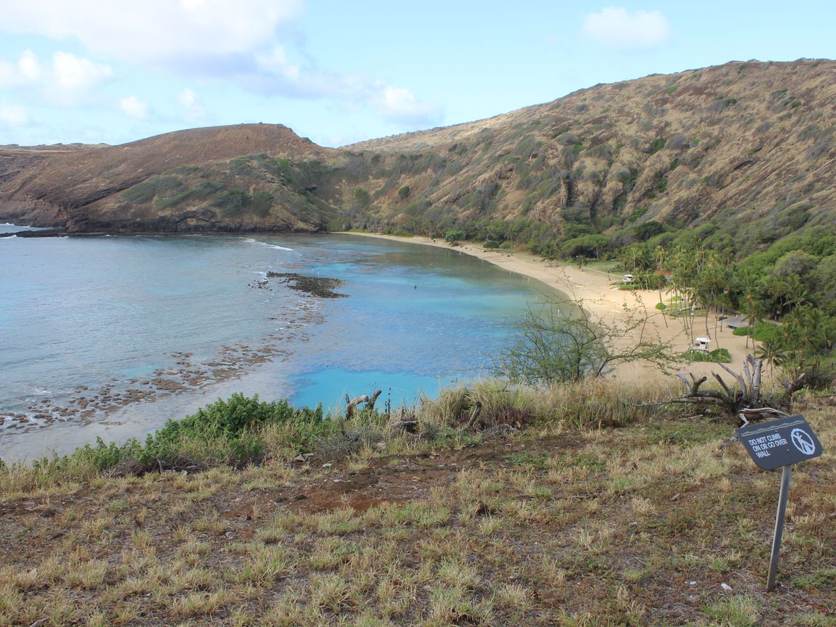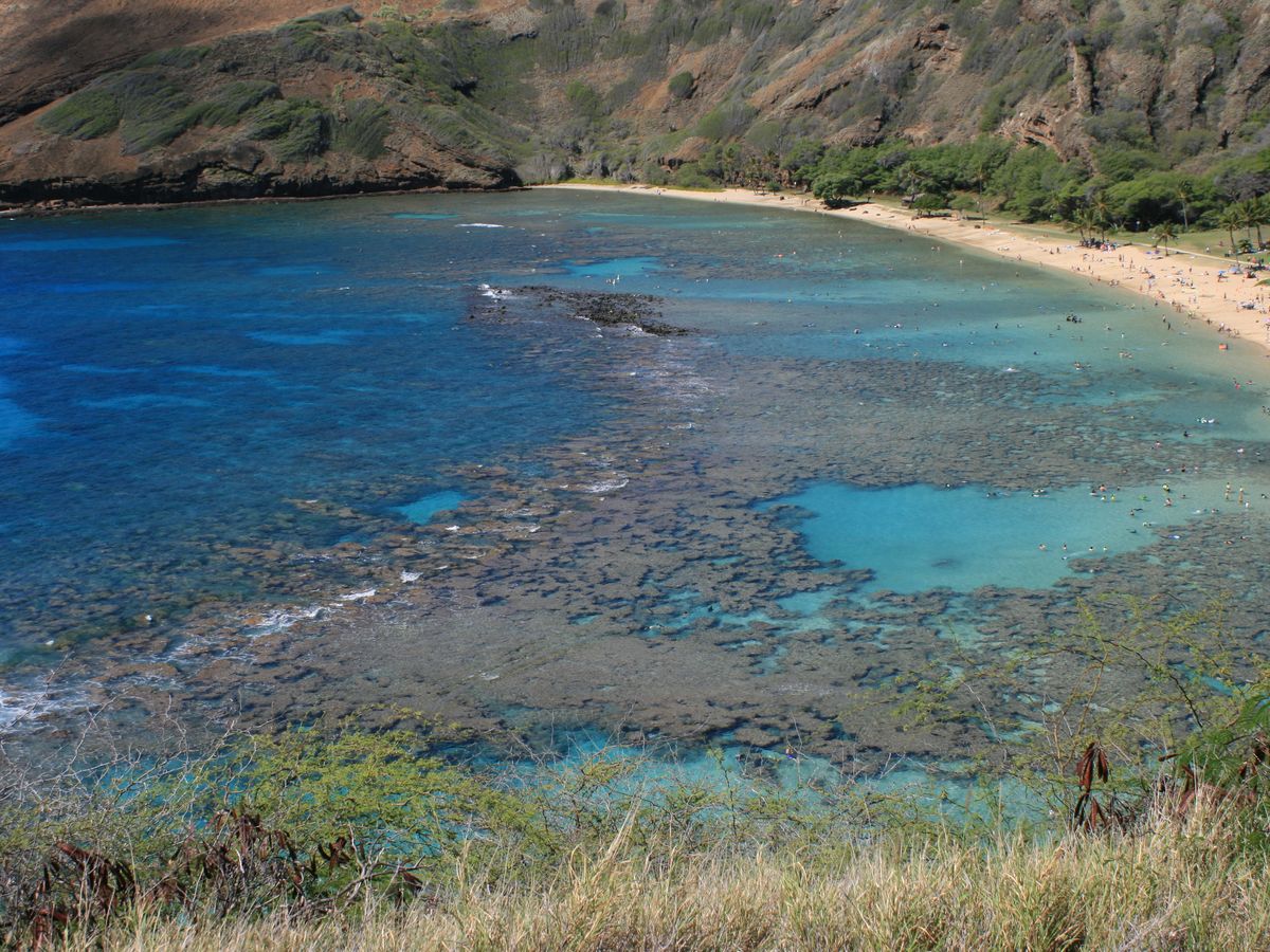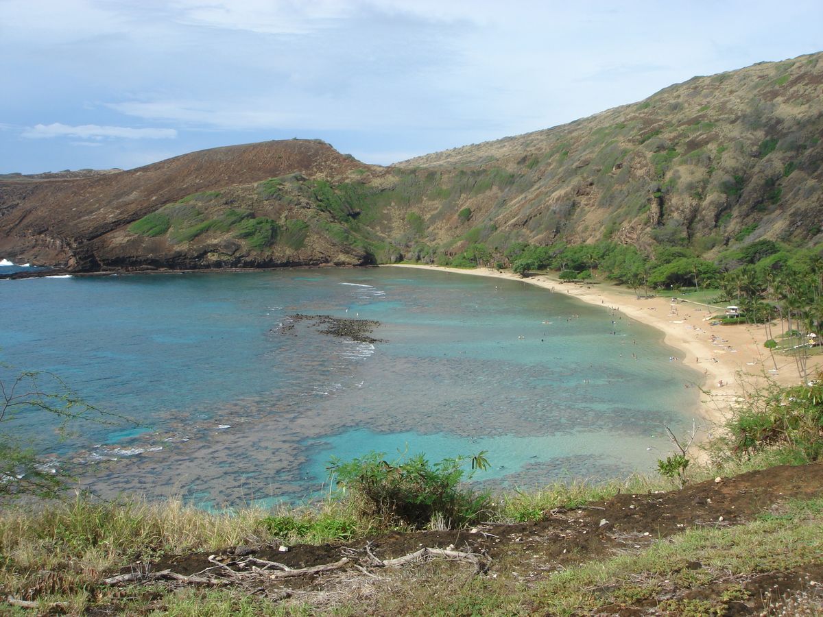 ハナウマ湾の円形の海岸でシュノーケリングをしました。ここは東ホノルルの南東端にあり、この美しい入り江がかつて火山のクレーターであったことを想像できます。今日、このクレーターは波の浸食によっておそらく水没し、重要な自然保護区と島で最も人気のあるシュノーケリングの目的地となっています。