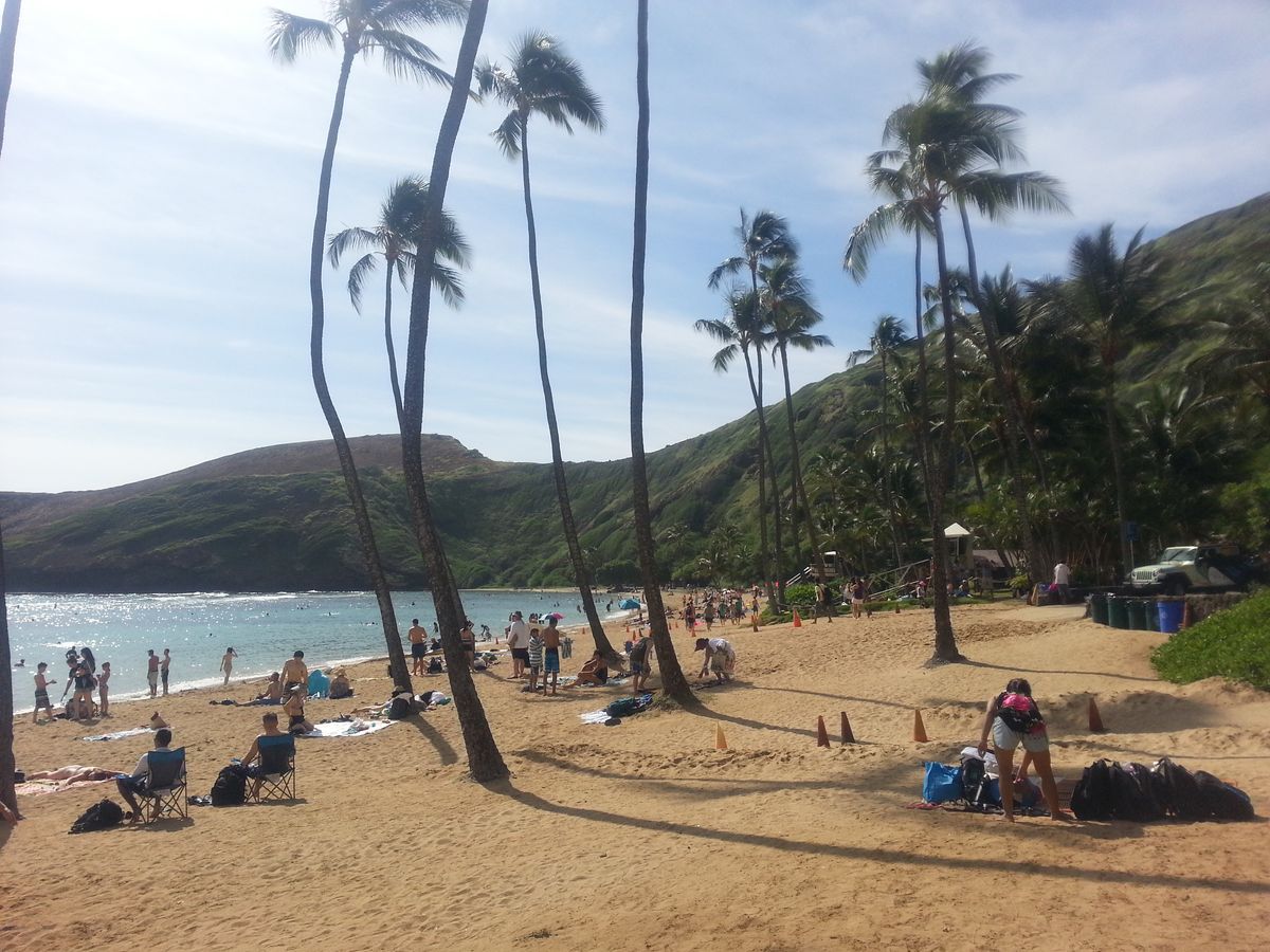 ハナウマ湾の入場チケットを買うのに30分以上。入って映画(5分くらい)をみるまで30分以上かかり、到着してからビーチにはいるまで1時間半くらいかかりました。