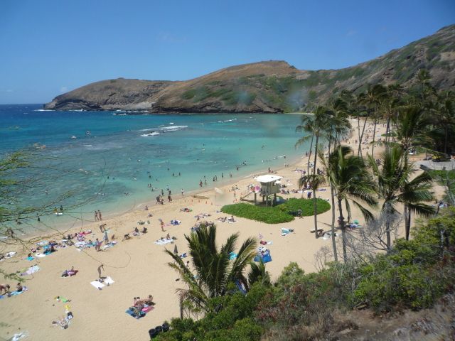 8:30ホテルピックアップのツアーで、ショップ経由ハナウマ湾に着いたのが9:40頃。タクシー駐車場が満杯で少々待ちました。平日なのに結構混雑・・これがピーク時ならかなり待つかナ?解説のショートムービーを見てからビーチへ。海の透明度は高くまた浅い場所でも種々の魚が見れて期待どおりでした。