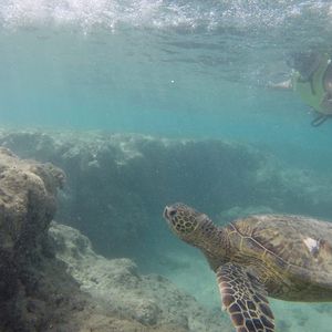ハナウマ湾の景色も本当に綺麗で感動していたのですが、水は少し冷たかったのですが海の中に入ったら、自分も魚になったんじゃないかと思うほどにたくさんの魚と一緒に泳げるので、夢中になってガイドさんについていきました。ハナウマ湾を熟知していらっしゃるから、ポイントを押さえて私達に素敵な魚の世界を見せて下さいました。特に子供の亀に出会えたのはシュノーケルをつけたまま叫んでしまうほど嬉しかったです。とても美しい海の世界で本当に楽しく泳げてしまうので翌日も参加できるなら続けて参加したいと思うほどでした。送迎時にはホノルルのパン事情やチャイナタウンのスムージー事情などを日本語で聞かせて頂き、とても楽しくお話できました。ハワイに行ったら絶対にまた参加することを心に決めて帰国しました。