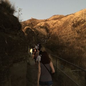 心配していた雨も上がり だんだん明るくなってきた頃下車して ダイヤモンドヘッドの頂上めざして出発! 思っていた以上に人が多く 小さい子もたくさんいて 登りやすいのかなぁ、、、なんて思っていたら だんだん傾斜がきつくなり パパやママに抱っこされて登る子も出てきたり 私達大人も 上着を脱いだり ひと休みしたり…