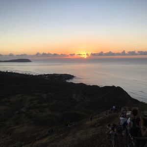 早起きをして集合場所に待っているとドライバーがお迎えにきてくれます。ダイヤモンドヘッドの入り口で説明を聞きます。代表の?日本人の方はユニークな方でした。バスの番号は最初の段階でしっかりと覚えておいたほうがいいです。帰りの集合時間もバスにより異なります。これが後々忙しくなった方々もいらっしゃると思います。6時に門が開き、登山開始。意外に大変でした。普段山に登ることがないですが、健康的で良いと思いました。ご来光前に頂上に到着。頂上には多くの人がいて、場所取りが大変でした。日の出とともに何枚も写真を撮りました。帰りは集合時間に間に合うように下山。集合場所の近くで無料の写真撮影を行ってくれるのですが、結構な列・・・バスに乗らなきゃいけないのに写真は撮りたいって人が多く居て、時間的に撮れなかった人も多くいました。自分達はギリギリ写真を撮ってもらうことができました。帰りはパンケーキを食べました。とても美味しくいただけて、別のハネムーンの方との仲良くすることが出来ました。