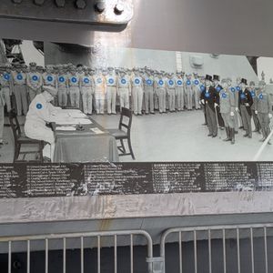 戦艦ミズーリは1944年1月に進水後、硫黄島上陸作戦や沖縄上陸作戦に参加し、1945年9月2日マッカーサー元帥率いる連合軍側と、重光葵全権率いる日本政府代表団との間で、東京湾上で行われた降伏文書調印式の会場となりました。