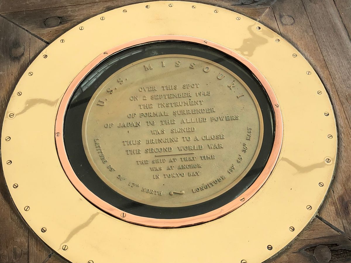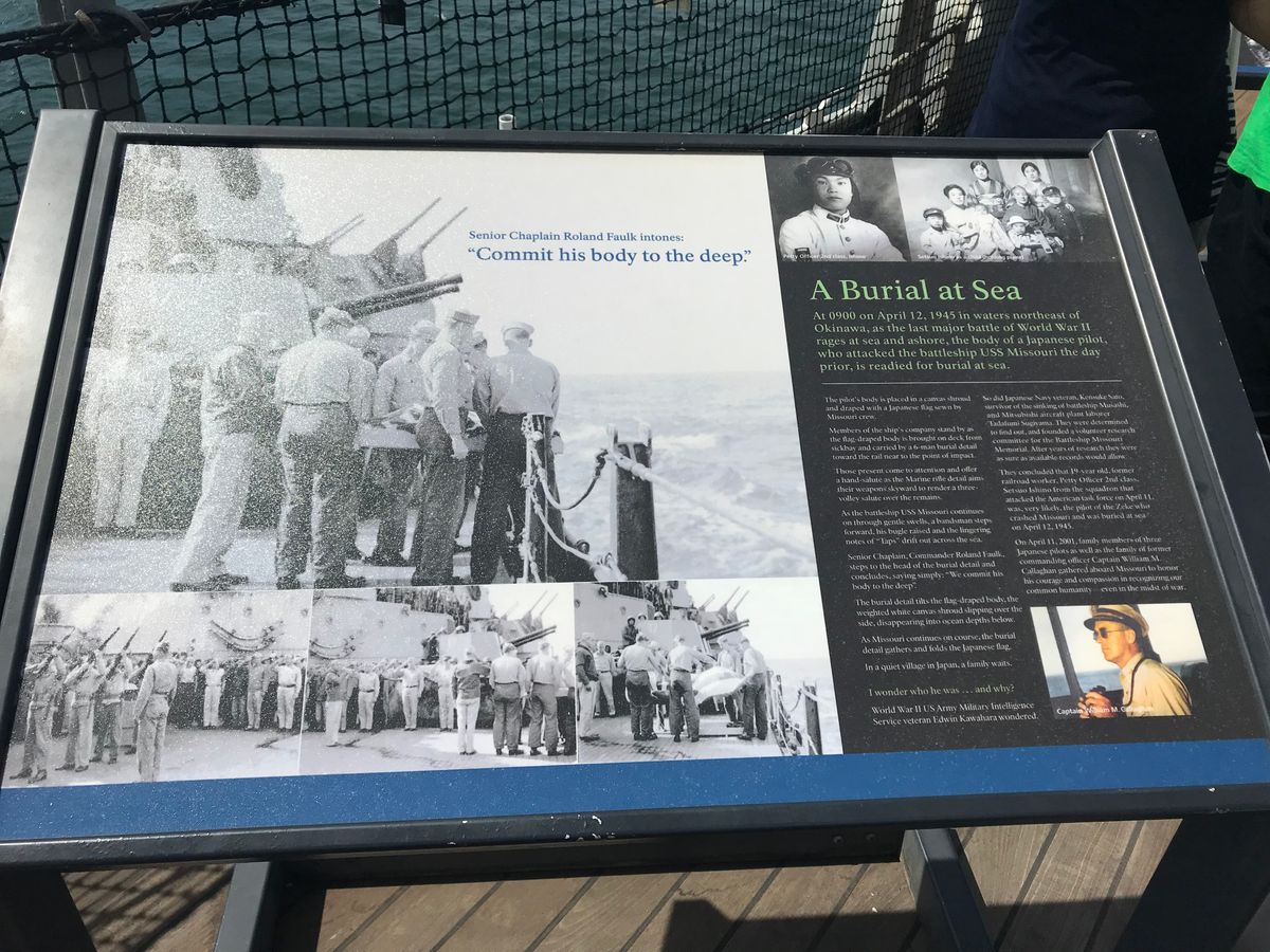 戦艦ミズーリの甲板デッキに激突転倒即死した日本兵士を国に尽くした英雄としてアメリカ側が旭日旗で覆って水葬した足の位置が残されている。そのデッキ側壁は僅かに変型しているのもそのまま残っています。