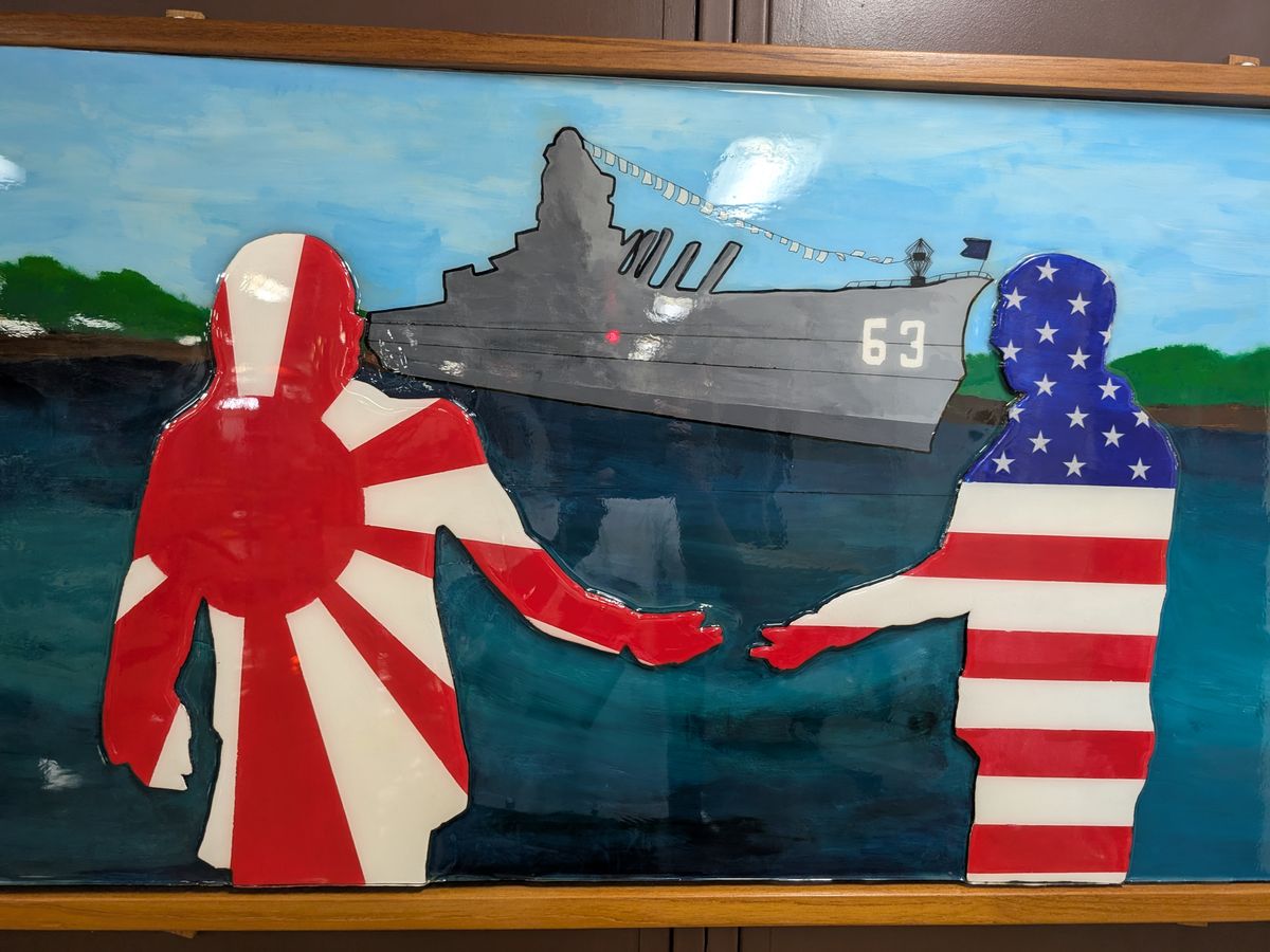 戦艦ミズーリは1944年1月に進水後、硫黄島上陸作戦や沖縄上陸作戦に参加し、1945年9月2日マッカーサー元帥率いる連合軍側と、重光葵全権率いる日本政府代表団との間で、東京湾上で行われた降伏文書調印式の会場となりました。