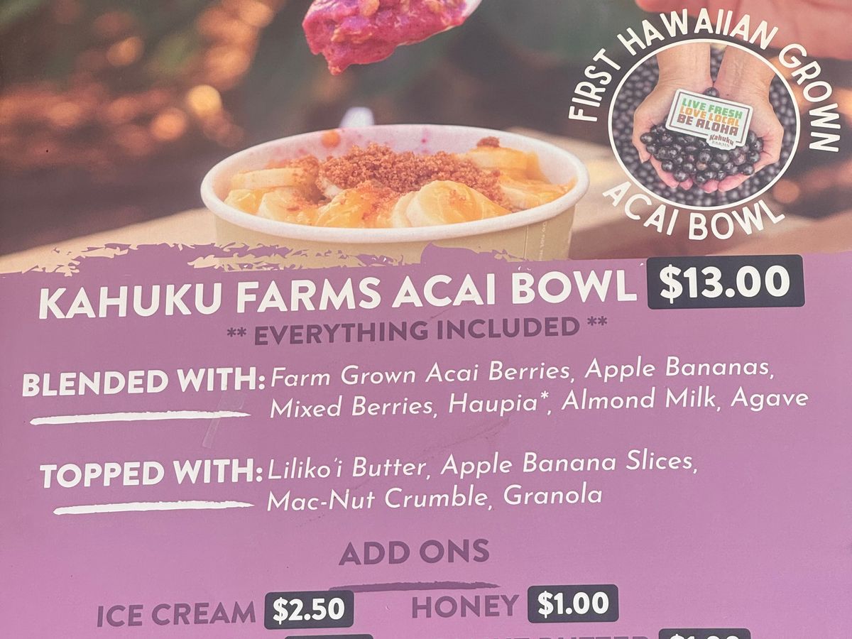 ワイキキで食べられるアサイーはほとんど輸入品という衝撃の事実。ここでは本物を味わえます。収穫の時期はこれかららしいです。食べられるなら一度こちらのアサイーを食べて欲しいです。