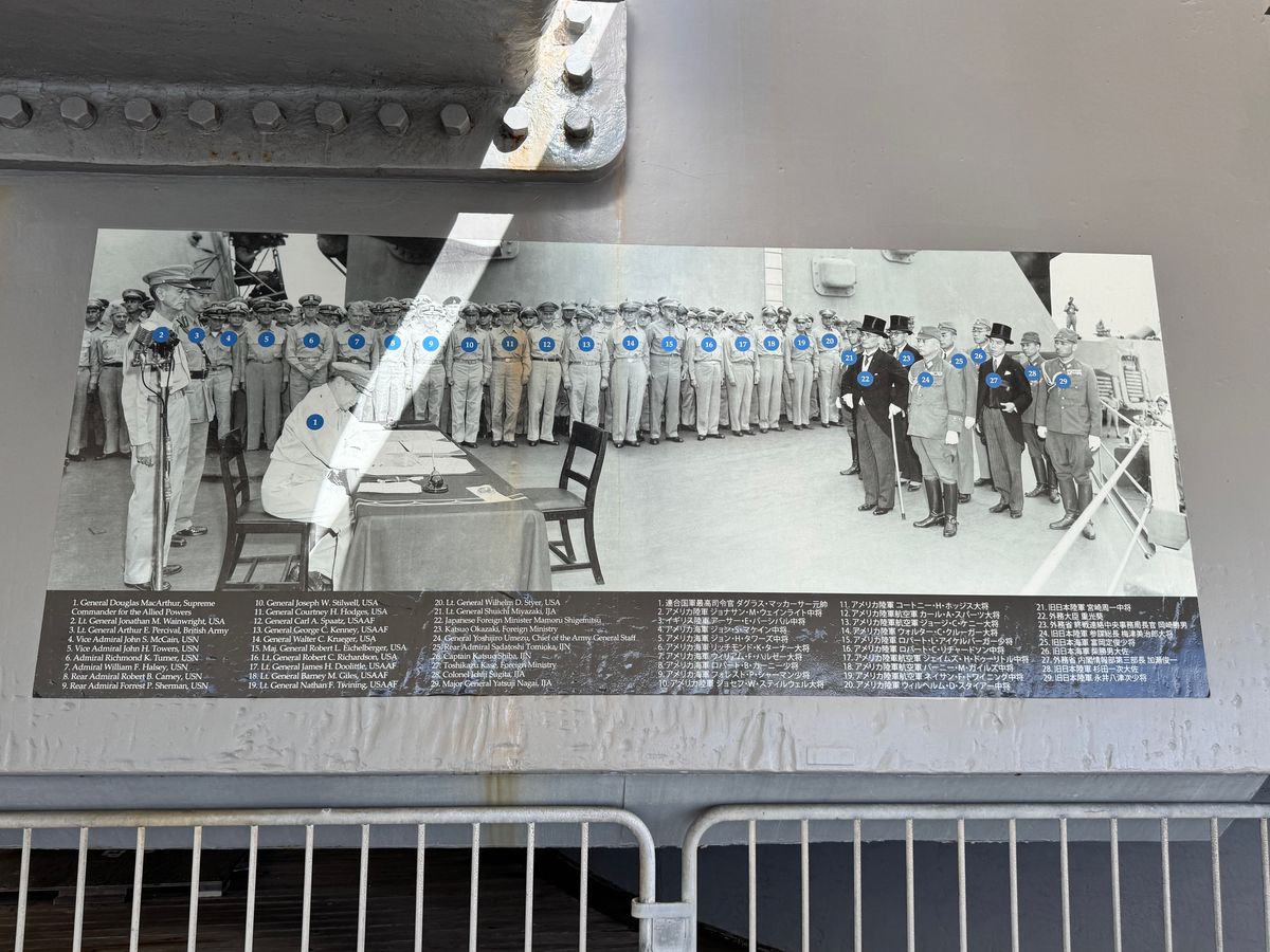 日本語ガイドがバスの移動から展示場見学の案内をしてくれるので安心して楽しめました。日本の降伏調印式の戦艦ミズーリ内を見学できます。調印式の場所でまさに調印式の写真が展示されていました。まるで当時の緊張感が伝わってくるようでした。降伏調印式の降伏文書も展示されていました。日本人がこの遠い場所で調印したかと思うと感慨深いです。写真の日本の外交官のお姿は怪我をしていても正装して立派で本当に頭が下がる思いがしました。中の展示は主に日本兵士の手紙や服などの遺品の展示と、船の中を歩きまわって見学できました。船のなかにあれだけ日本人の遺品が展示されているのに船の前に掲げられている沢山の国の国旗が掲げられているなか、日本の旗がないことが印象にのこりました。案内の日本語ガイドが、アメリカは日本兵のご遺体も丁重に埋葬した話しを紹介してくださいました。戦艦ミズーリ内では日本兵士の遺品の展示を見ることができます。その手紙からは、家族を思い命がけで守ろうと駆け抜けていった日本兵のあたたかな人柄が伝わってくるようで泣けてきました。