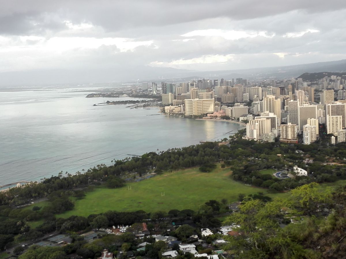 ダイヤモンドヘッドですが、片言の日本語をはなすドライバーに連れられて登山道の入り口駐車場で降ろされます。大体1時間後にこの場所に戻ってくるようにと指示され、そこからは自由になります。登山道はとくに渋滞することもなくスムーズに進むことができました。時間帯的に日の出は見られないかと思っていましたが、頂上手前の撮影スポットのような場所で見ることができましたし、写真を撮ることもできました。そこから、大体20分ぐらいで頂上に着きます。あいにくの曇り空で写真のような景色とまではいきませんでしたが、眼前に広がる広大な空と海の景色は実際に見てみないと分からない迫力があり、登ってきた疲れを忘れるほど感動でした。