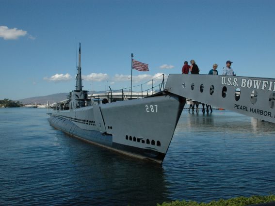 ホノルル名物の大渋滞を要領よくかわしながら30分ほどでパールハーバー・ビジターセンターに到着。なお、参加注意にもありますように海軍基地内に入るため、手荷物はカメラ、ビデオ以外ポーチやウエストバックも持ち込み禁止ですが、うっかり持参した場合はエントランス手前右手にある荷物預かりが一つ3ドルで預かってくれます。入場するとガイドさんが参加者分の乗船指定券を入手しますが、その日の混み具合や天候等に応じて、乗船時間を調整します。参加した日は晴天に恵まれ、ベストコースが選択できるとのことで、11時の乗船券を入手し、まずは潜水艦のボウフィン博物館へ。艦内の見学はコースに入っていませんが、実は艦内が異常に狭く、現役当時のままでの展示のため、お年寄りやお子様では短い時間で回りきれないのと、多少危険な箇所があるため、事故を避ける意味から除いているようです。ビューポイントからボウフィンの解説や、ハワイ王朝時代から米国統治に至る対岸のフォード島にまつわる歴史的な解説と、陸上施設のボウフィン博物館屋外に展示されているMK14魚雷やトマボークと並んで旧日本海軍の特攻兵器「回天4型」も展示されていました。なお、朝食を食べ損なった方は博物館脇の売店でホットドックが3ドルで購入できます。
