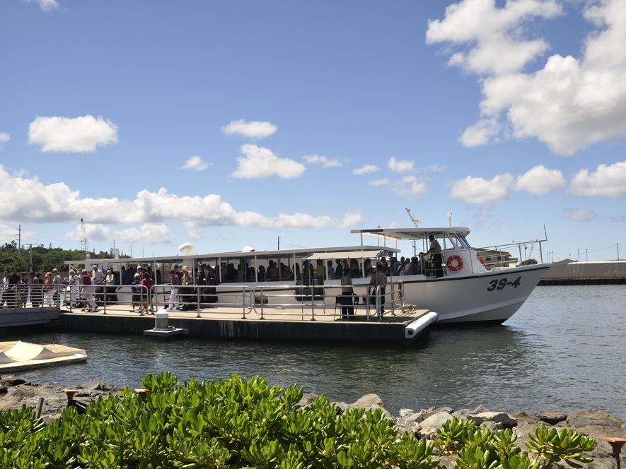 一人で行くと、おそらく、アリゾナ記念館へのシャトルボートのチケット取得のために並び、シャトルボートの乗船までの空き時間にミズーリへ行こうとするとシャトルバスの待ち時間で待たされ、さらにミズーリからアリゾナ記念館へのシャトルバスの待ち時間で待たされたでしょう。