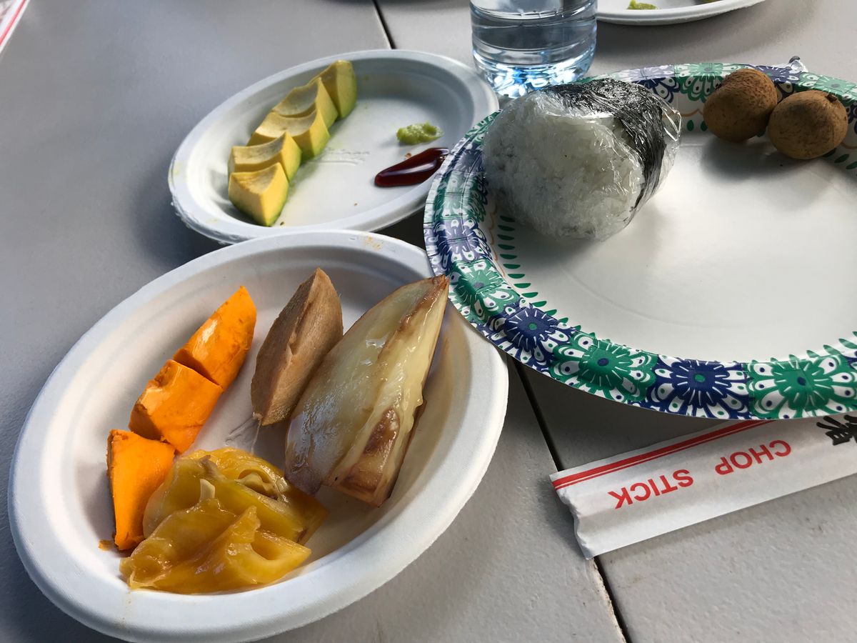 散策が終わった後は、おにぎり、アボカドやマンゴー、ドラゴンフルーツなど収穫してあった、食べごろの果物をいただきます。
