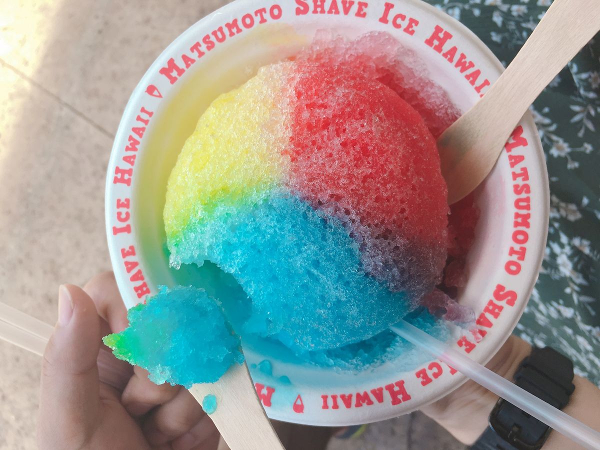 ハレイワではガーリックシュリンプを先に注文してもらえます。フリフリチキンはあまり待たずに購入できました。さすがにマツモトシェイブアイスは長い行列だったので諦めてガイドさんオススメの近くのアオキシェイブアイスを食べました^_^ここは地元のお客さんが多いお店でした。この後はソープファクトリーとワイアルアコーヒーファクトリーでモヤさまの形跡を感じながら買い物。美味しいコーヒーをいただきました♪