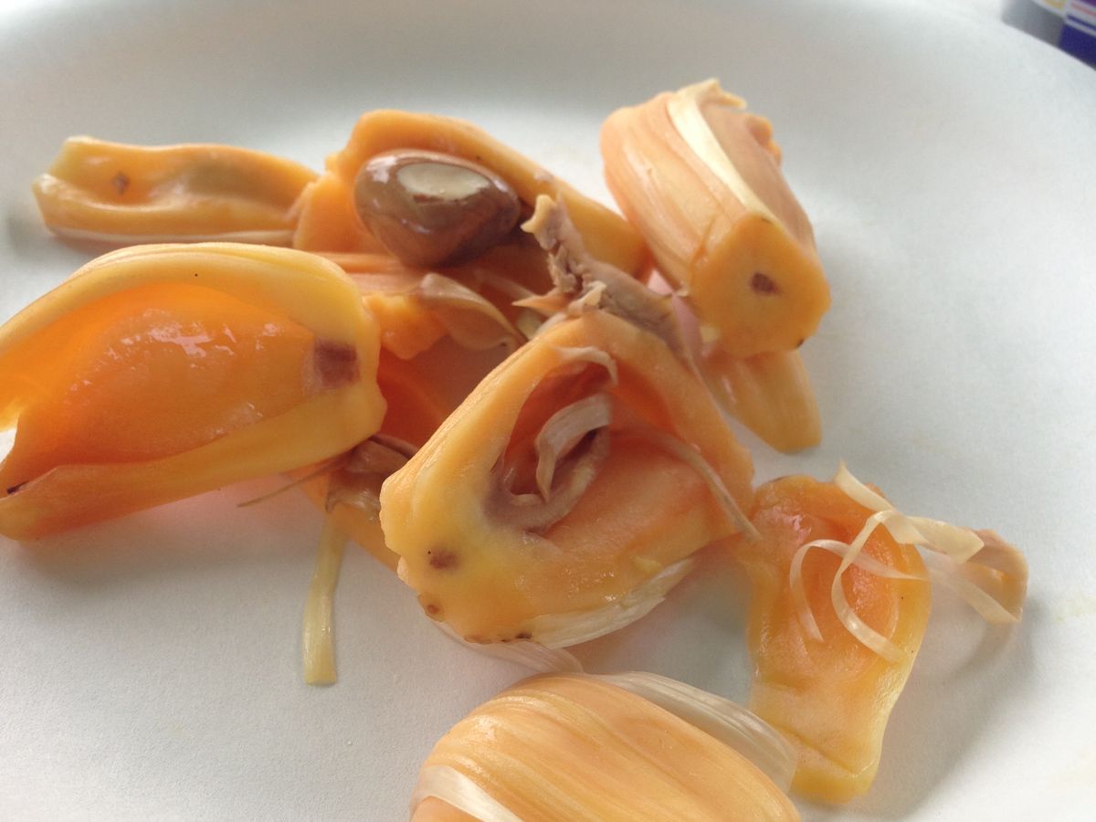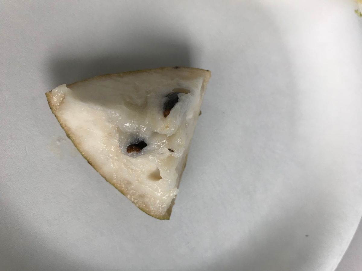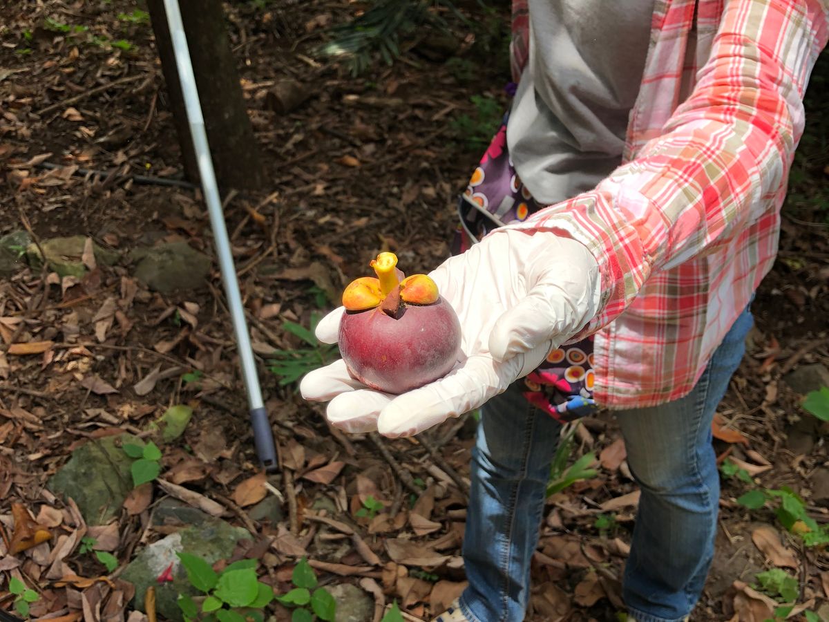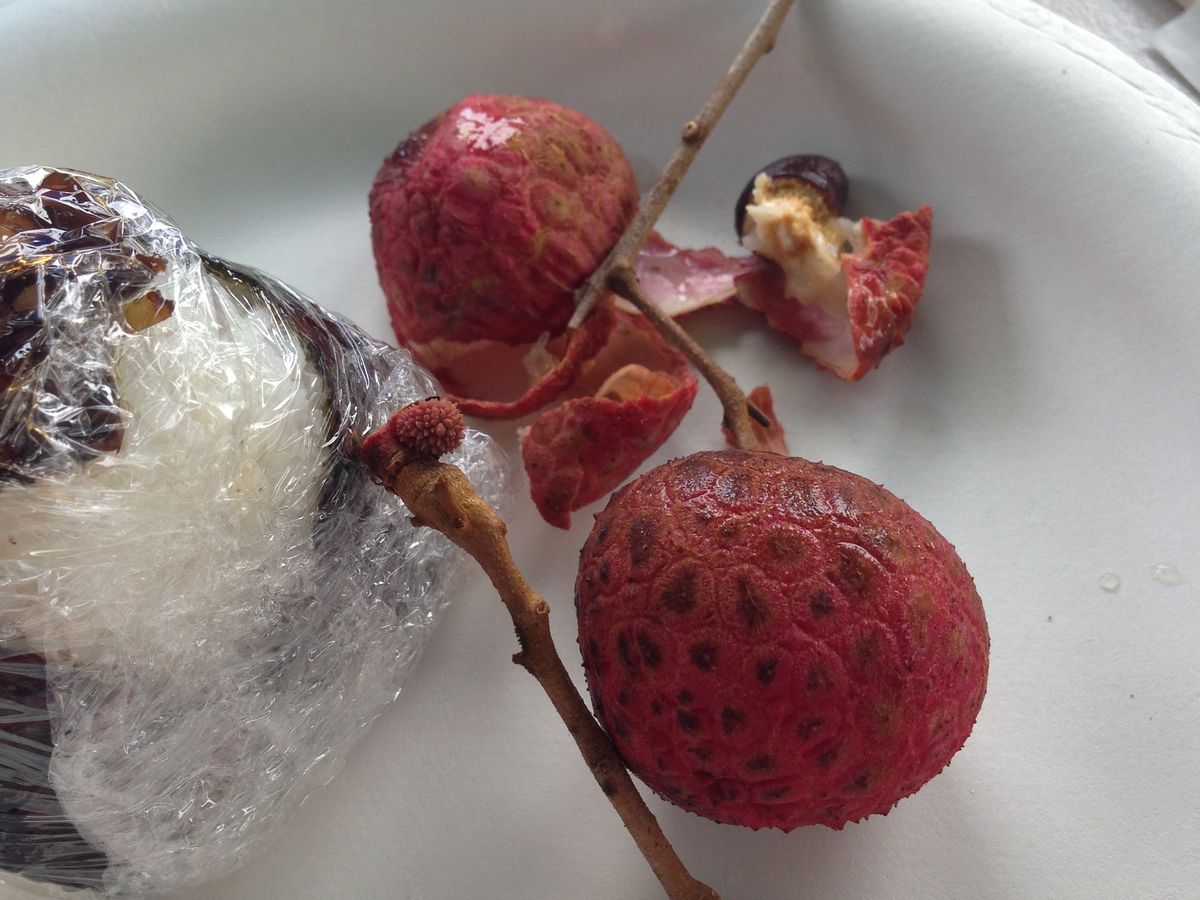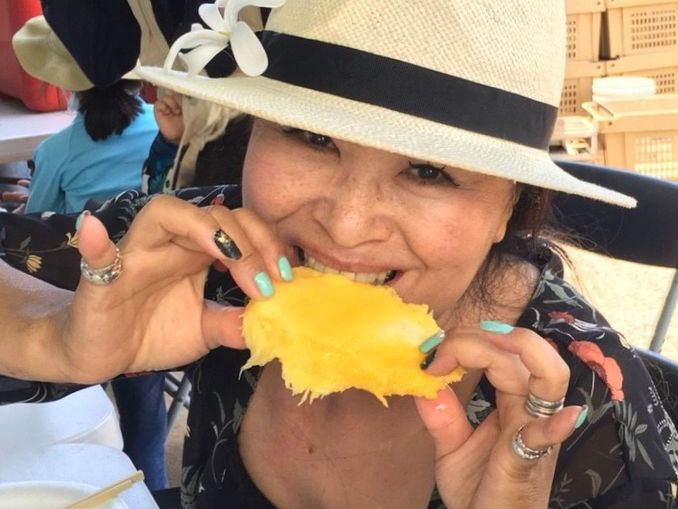 ジャボチカバの果実を食し、ハスの実、イランイランの匂いを嗅ぎ、StarApple、Cambuca、JackFruit、MameySapote、等々の結実の様子を見たり、食べられそうな熟れ具合のものはその場で試食をさせて頂きました。今回の試食はいつもより数が少なく6~7種類であったのが残念でしたが、ミカンの木があり、大きさも形も良くなく、種も沢山あったのですが味は最高でした。果樹園探索が終わりフルーツ食べ放題では、アボガド(刺身醤油で食べます)、ピタヤ、ライチ、ジャックフルーツ、マンゴー、ハニークリームパイナップル等と参加者全員お腹いっぱいになる程堪能させて頂きました。また、Makiさんが用意された「おにぎり」がとても美味しく1人1個では足りないと感じました。