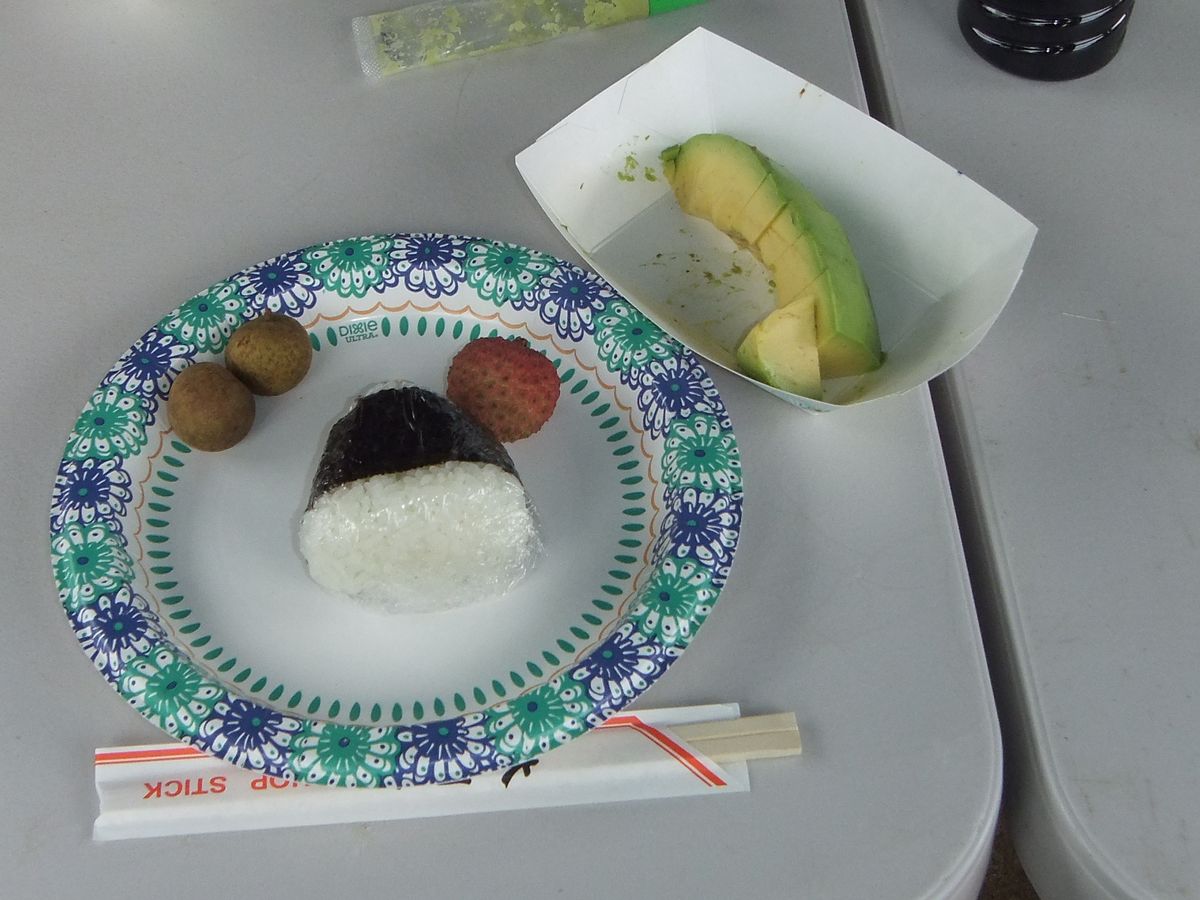 その後、お店の軒下にあるテラスで昼食のおにぎりと色々な種類のフルーツが用意されていました。