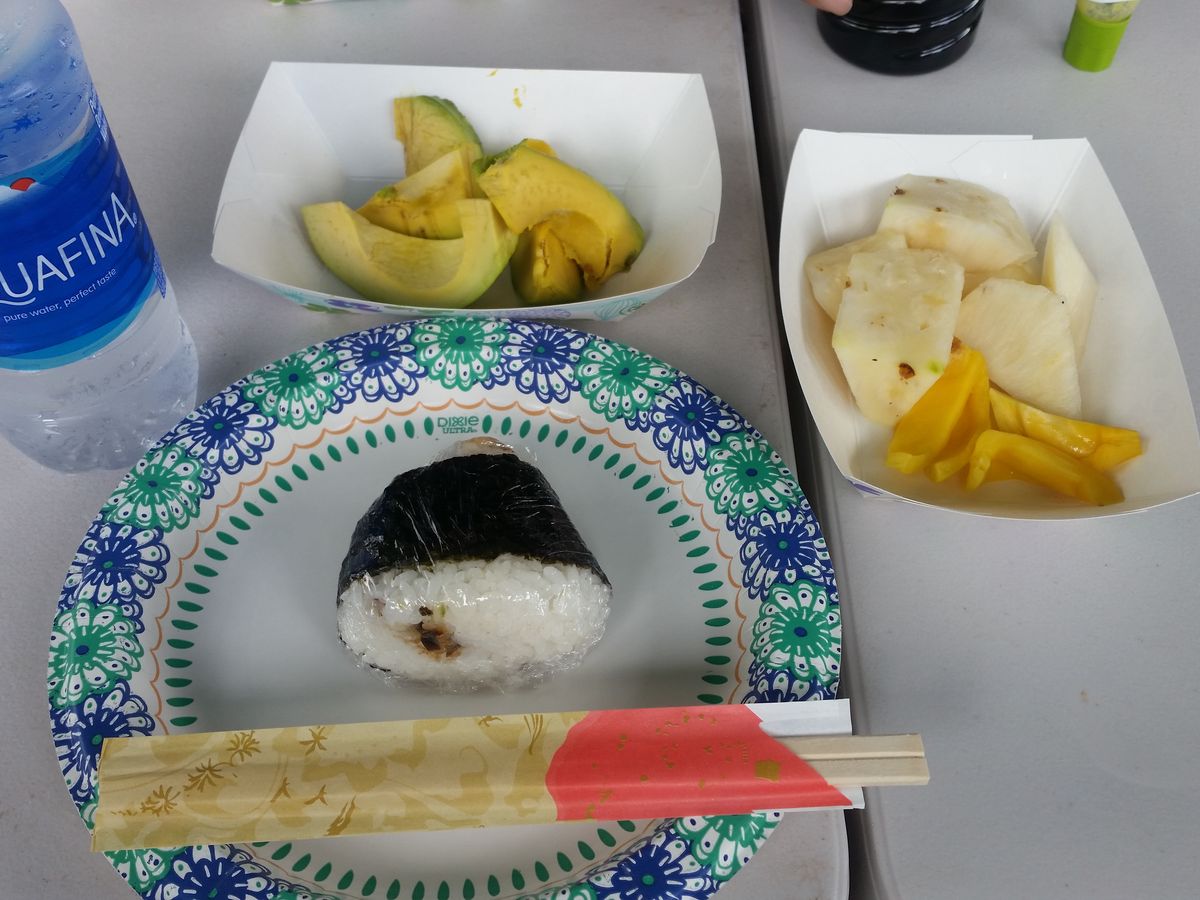 グレープフルーツなどを試食これで最後におにぎりで終わりなのかなと思ったらそうではなかった、最初に到着した場所にテーブルがありそこでさまざまな