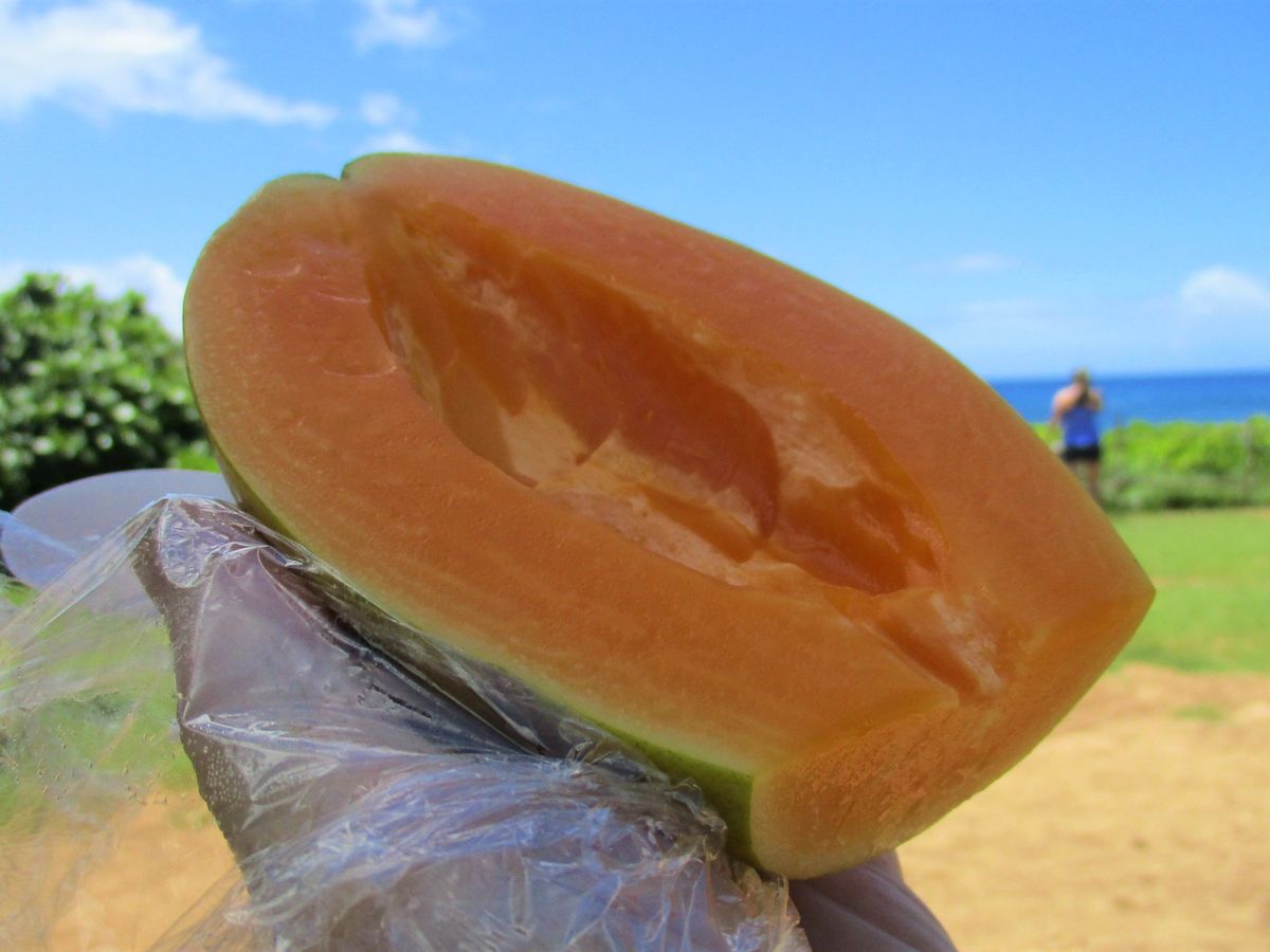 ハワイ=フルーツ天国と言いつつも、実際に目の前で生っている実を見て/取って/味わうことが出来たのは新しい経験でした。実のなる季節で左右されるとの事でしたが、20種類余りを味わえたのはラッキーです。あまりに果物を食べ過ぎて、おにぎりはお持ち帰りとなってしまいました。ガイドのユミコさんの説明は力が入っていて、飄々と実を取ってくるマキ社長といいコンビでした。行き道で立ち寄ったマカプウ湾もパワー全開でした。また訪問したいです。