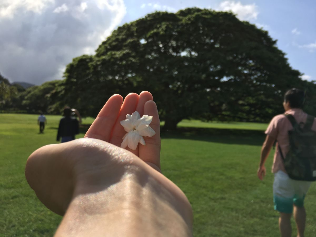次にモアナルアガーデンのこの木なんの木を訪れました。出発時間が早いツアーな為、他の観光客が訪れる前に行くことが出来、いい写真を撮ることができました。坂井さんがかわいい花を摘んできてくれ、わざわざ私たちのところまで持ってきてくださり植物の説明をしてくださいました。