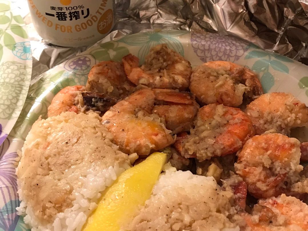 ホテルに着いてから和田さんが冷めないようにと工夫してくれた熱々のジョバンニのガーリックシュリンプをつまみにビールで乾杯してサイコーでした。
