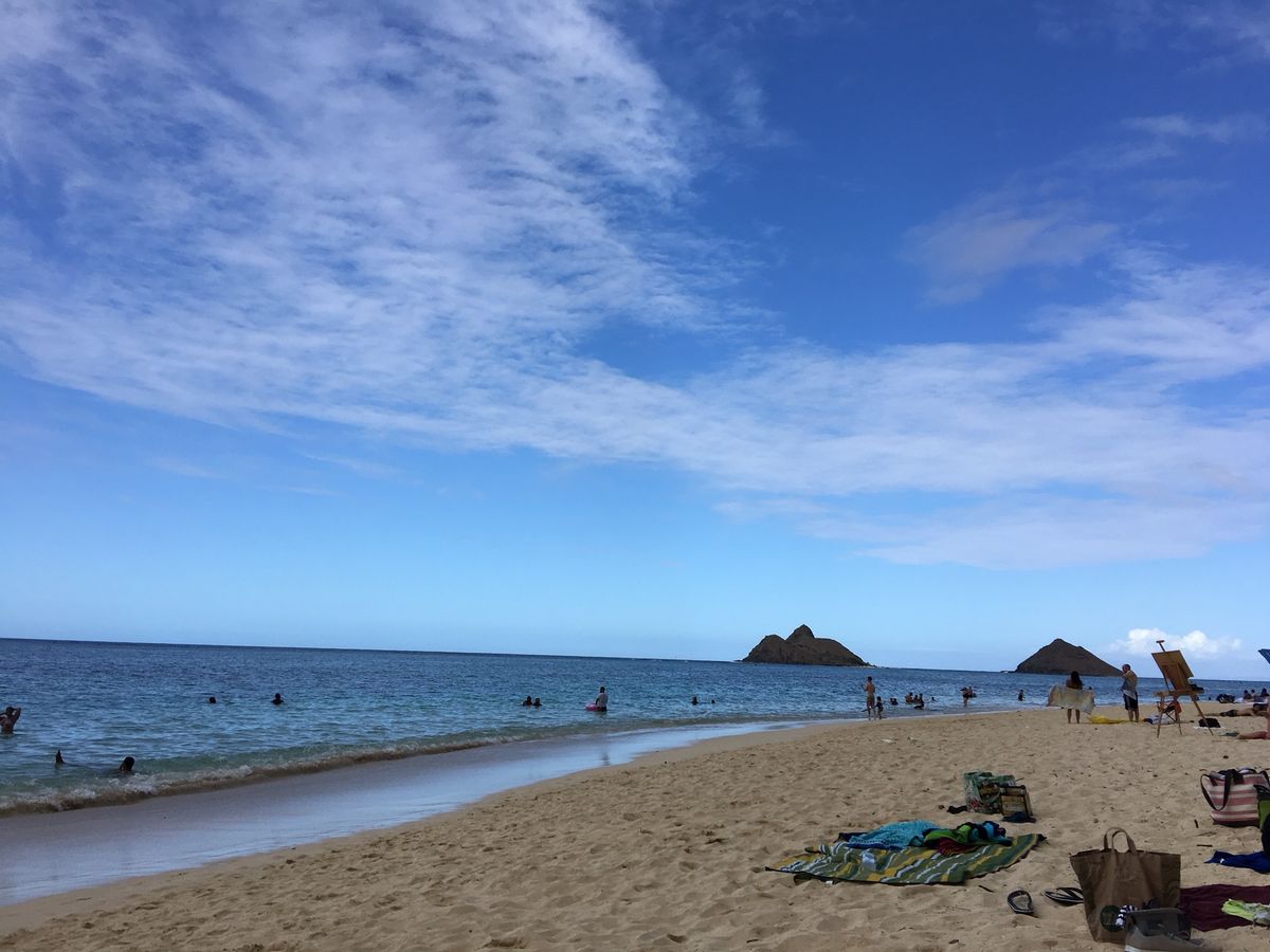 カイルアビーチ到着。超きれいな海で写真撮影‼︎自分達は妊婦な事もあり、泳ぐ事は出来なかったですが、他の2組の夫婦はきれいな人の少ないローカルエリア?の海でシュノーケリング楽しめたそうです。人見知りな自分が他のお客さんと打ち解け会話も弾んでます。で、自分達だけは別行動でショッピング。余裕で融通が、ききます。