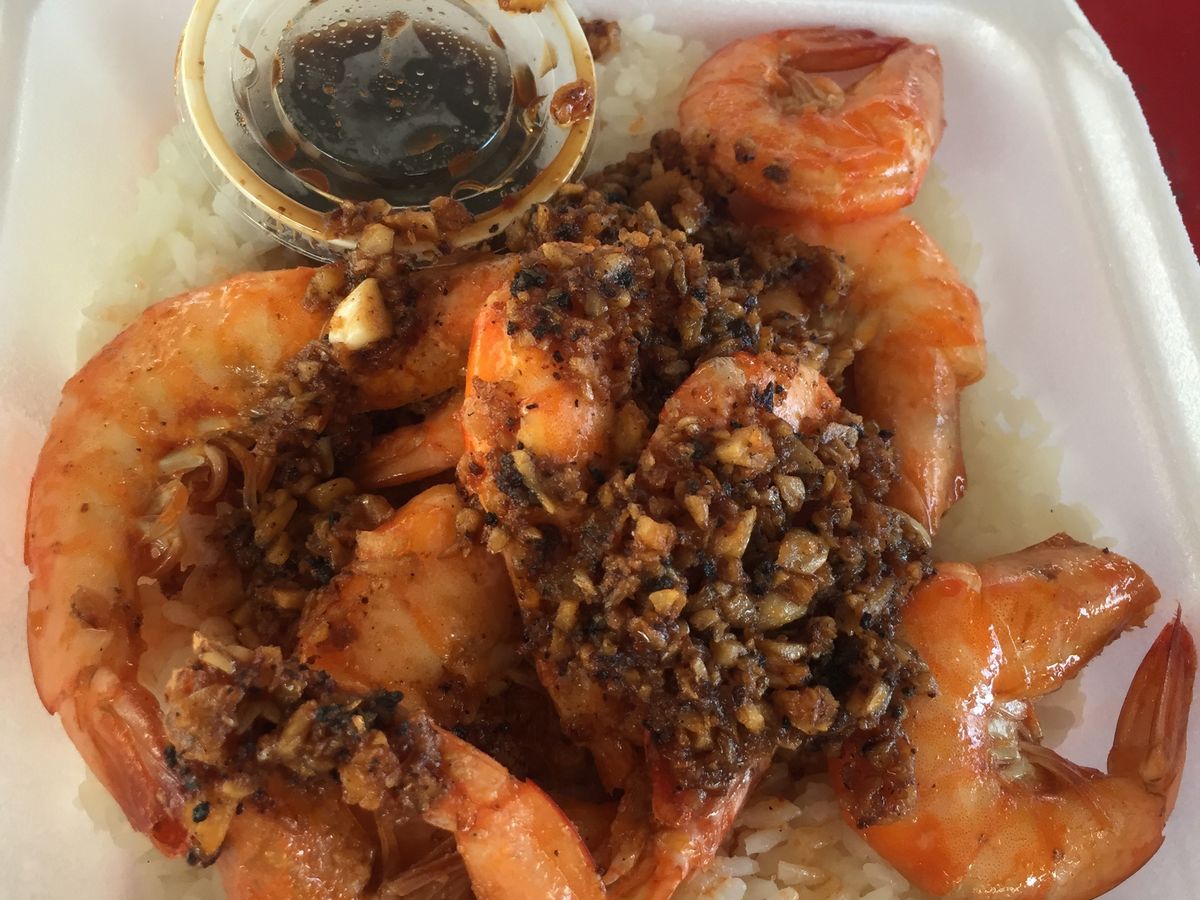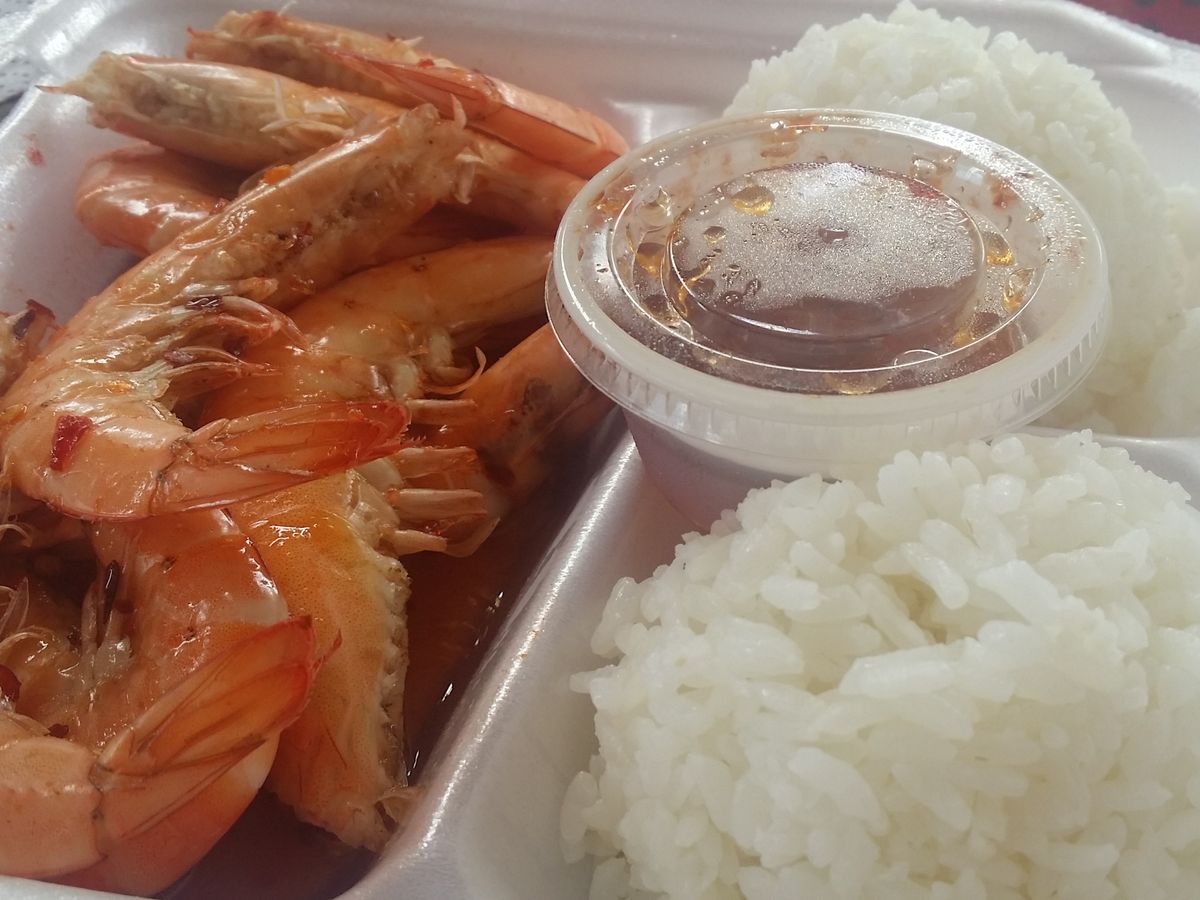 周遊の途中でのB級グルメの数々(マグロの醤油漬けのアヒポキ、昼食のガーリックシュリンプ、冷えたパパイヤ、パイ等々)みんなおいしかった!!