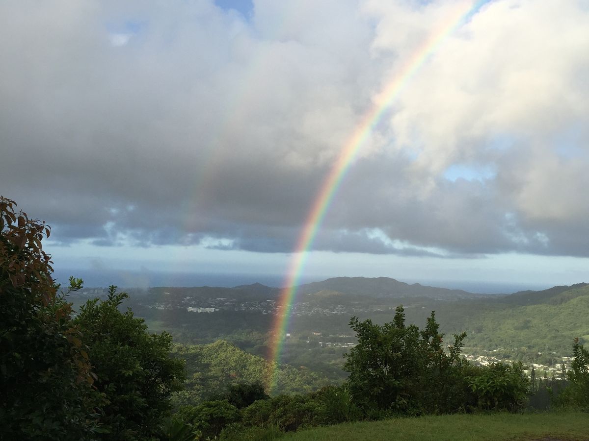 そしてなんといってもハイライトの帰り!ワイキキに向かう途中、雨が降ってきてふと窓の外を見るときれいな虹が!小ぶりになったので途中の路肩で停めて皆で外に出るとダブルレインボーになりました!!こんなに近くで色鮮やかな虹を見たのは初めてでした。娘も大感激したらしく、その後ずっと「レインボー好き~」と言っています。参加者のみなさんの日頃の行い?が良かったので、なんて和田さんおっしゃっていましたが、本当に和田さんのおかげだと思います。