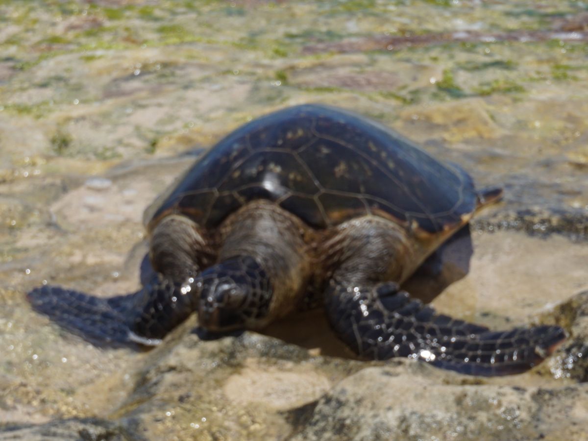 ラニカイでは、魚をたくさん見る事ができ、特に、ニモっぽい親子を発見し、ずーっと見入ってしまいました。とてもかわいかったです。また、ホヌビーチでは、陸地からの和田さんの的確な指示により、岩場まで泳いでいったところ、すぐにアオウミガメに会う事ができ、かなり近くで見る事ができました。海藻ごはんに夢中なウミガメさんでしたが、ピョコッと水面に顔を出してくれた瞬間に、全員で記念写真を撮っていただくことができました♪(ずっとカメラを構えてシャッターチャンスを狙ってくださっていた和田さんのおかげです)