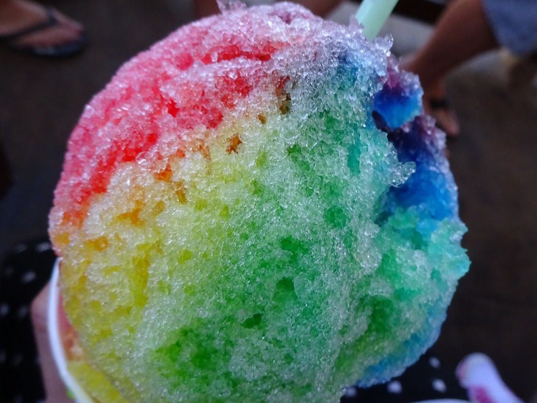 ハレイワタウン散策では、フリフリチキン、松本シェイブアイスは外せない。