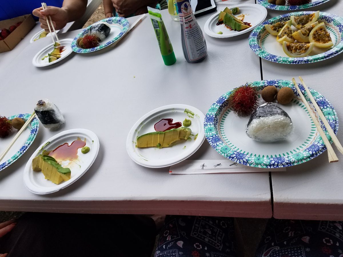そのあと、椅子テーブルが用意されており、見たことも聞いたことも無いフルーツほを沢山食べました。おにぎりもあり美味しいかったです。