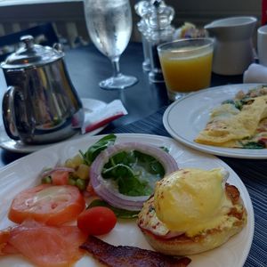 海が見える席で朝食が楽しめます。エッグベネディクト美味しいです。