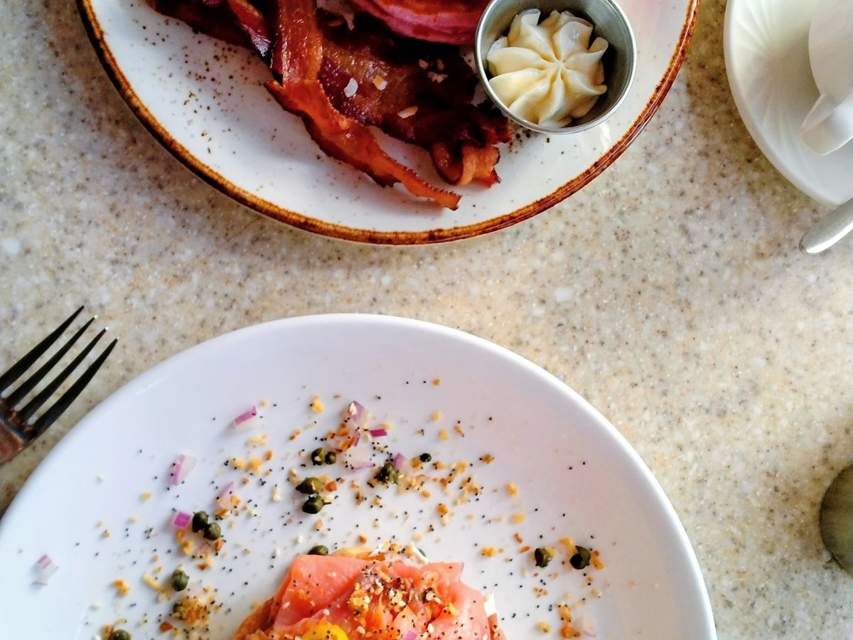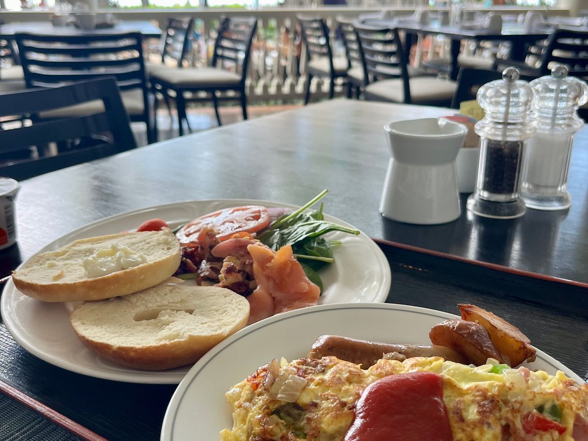 夫はパンケーキ、私はスモークサーモンとクリームチーズのベーグルを注文。