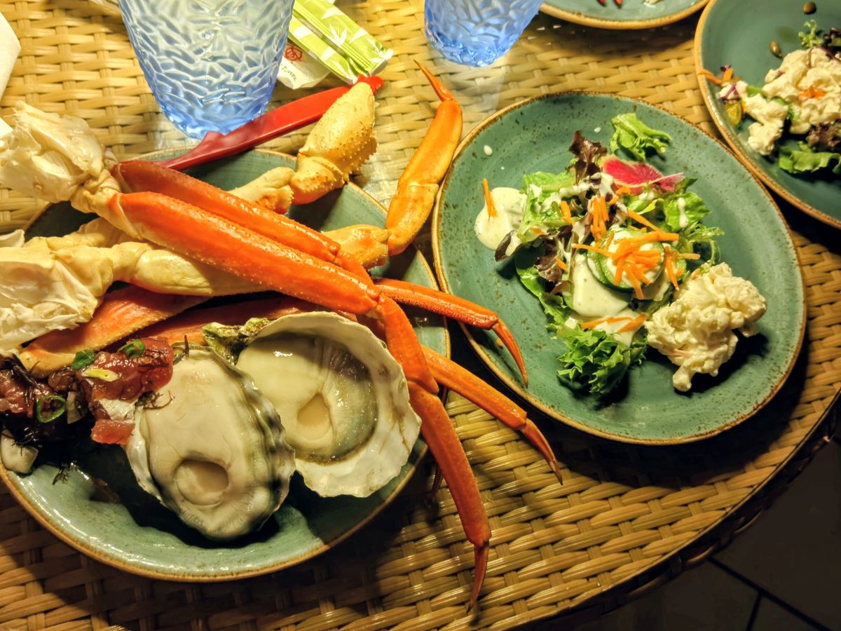 ローストピープ、カニ、生牡蠣、揚げ物、デザート、お腹いっぱい食べました。