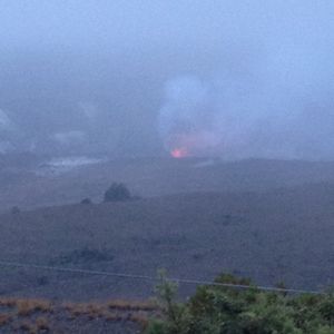 お目当ての火口は訪問する日時と天気によって見え方は様々なようで、私たちの時は、霧やガスの合間にほんのり赤く染まる火口が遠目に見えた、という感じです(写真参照)