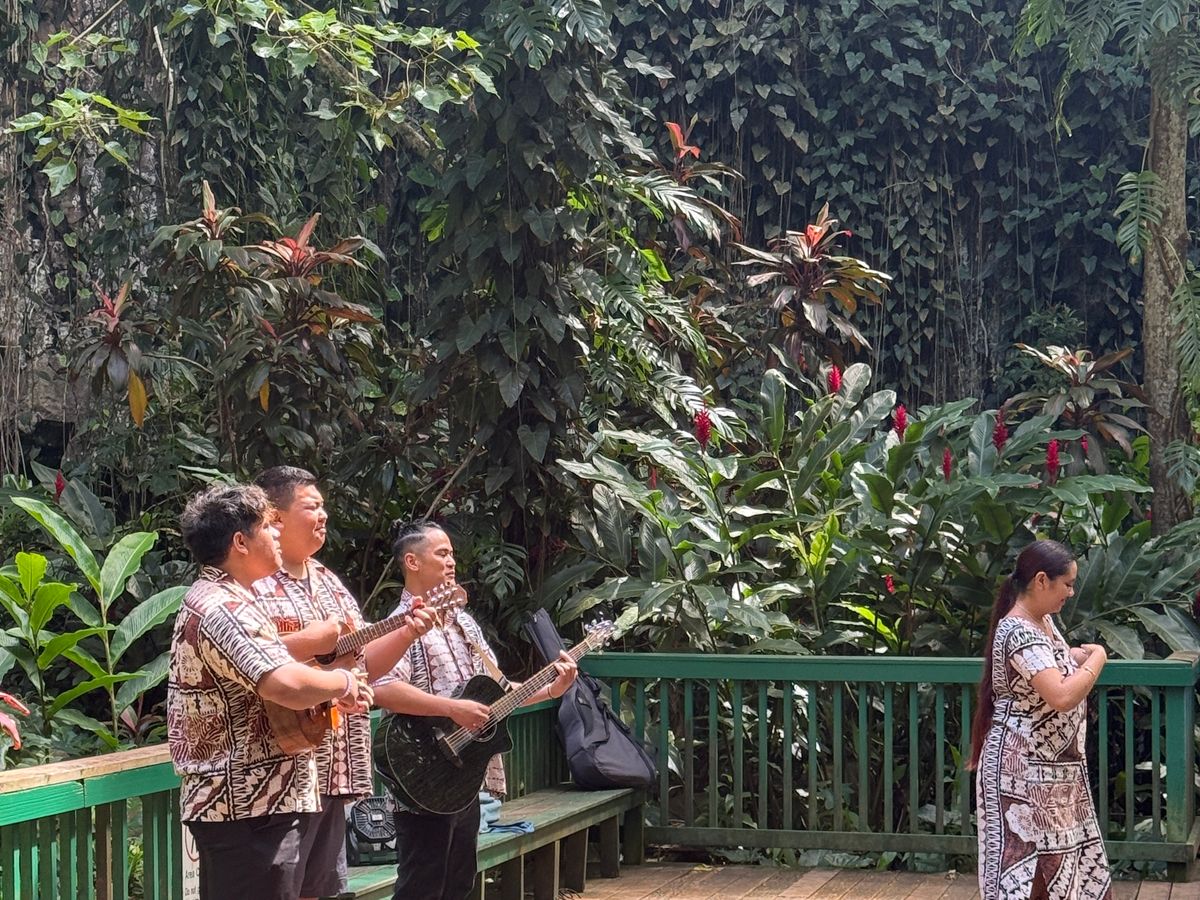 川沿いのボートライドでは、緑豊かな熱帯の風景の美しい眺めを楽しむことができ、ライブのハワイアンミュージックとフラが本格的でお祭りのような雰囲気を加えていました。