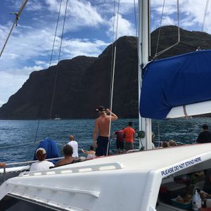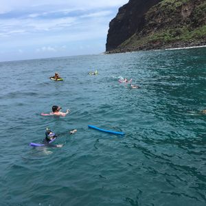 This snorkel sail was by far the highlight of our vacation in Kauai. For years I've dreamed of sailing along the Na Pali coast and it was more beautiful than I ever imagined. The emerald cliffs were absolutely breathtaking. Other passengers spotted whales breaching the water nearby but I couldn't take my eyes of the coast. As we began our sail back to the harbor we were accompanied by a pod of dolphins who swam alongside and in front of our boat for several minutes; it was magical.