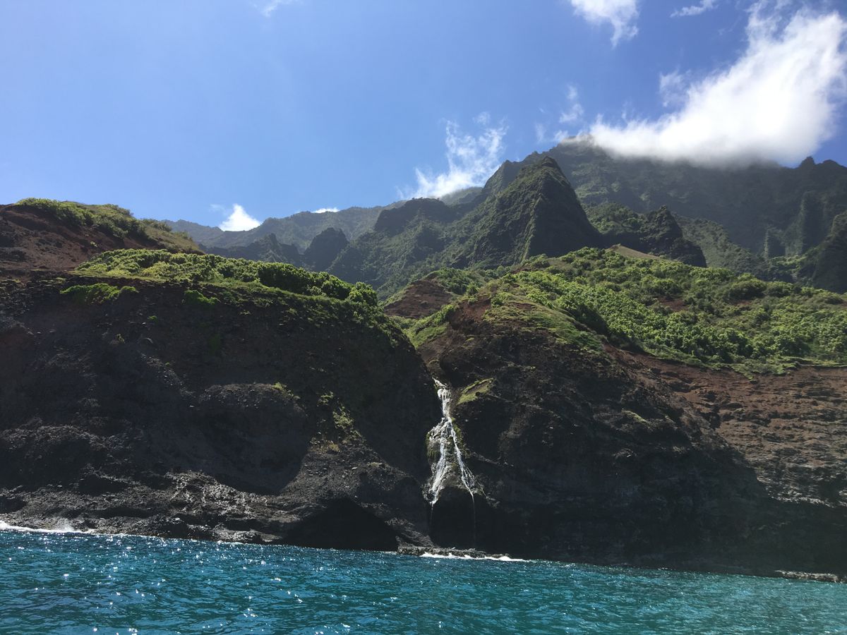ハナレイ湾から出発し、次々と現れるナパリの景観、朝の光に照らされる緑深い山々が素晴らしかった。ラフティングボートのため崖の近くまで行ってとても迫力があります。滝、ケーブ、海亀、イルカ、モンクシールが見れました。所々でとまって説明をしてくれました。シュノーケルもできました。