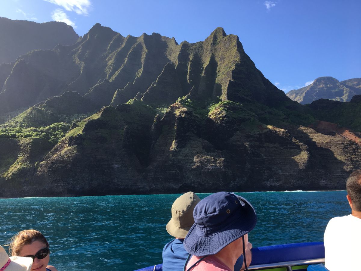 途中でイルカの群れに遭遇して船の下までやって来ました。少し遠くでしたが、クジラも見る事が出来ました。ナ・パリ・コーストに近づくに連れて断崖絶壁の風景が近くに見え大自然の景色に満喫しました。帰りは船の上でのディナーも最高でした‼