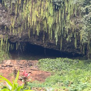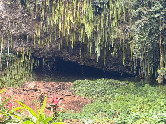 過去のハリケーンや土砂崩れの影響で洞窟内には入れませんが、その雰囲気を楽しめました。またシダの洞窟の前でフラや歌を歌ったりで楽しませて頂けました。