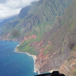 このヘリコプターツアーは、カウアイ島旅行のメインイベントで最大の目的でした。乗客は私の他にカップルが2組、5名です。座席は左の窓側に指定されました。ヘッドホンを付けるとパイロットが英語でガイドをしてくれました。早口でよくわかりませんでした。しかし、窓の外の風景には感激でした。ワイメア渓谷とナパリコーストを空から上から見たいという願いが叶いました。ビデオを取ることに必死でした。パイロットは右や左に旋回してくれて右側の乗客と左側の乗客に均等にシャーッターチャンスを作ってくれました。上からとさらに渓谷の中程まで降りて岩肌に最接近したりサービス満点でした。