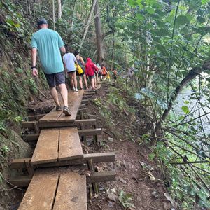 このエクスカーションは必見です。景色は素晴らしかったです。そこに行くには時間がかかりますが、2マイルのカヤックを漕いだ後、滝まで約1.25マイルのハイキングがあります。ガイドはその地域についての素晴らしい事実を教えてくれました。初めての方にはパドルの漕ぎ方を教えてくれます。川を渡る必要があり、降雨量によっては深くなることがあります。これはややハードで、岩のある不均一な地面を歩き、川を渡ることになりますので、良い水陸両用シューズが必要です。カヤックを水まで運ぶのを手伝う必要がありますが、あまり長くはなく、通常は4人でカヤックを運びます。トレイルの一部には木の板がありますが、最初の部分にはありませんでした。美しかったし、頂上に着いたときには滝が満水でしたが、これは降雨量によって異なります。非常におすすめです。