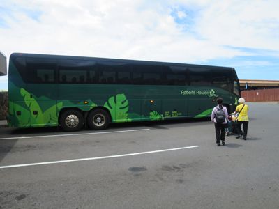 優しいおばあちゃんが迎えてくれました。私たちだけなのに、なぜか大型バスでホテルまで行くことになってしまい、フロントエントランスに横付けできず、裏からになってしまい、階段を数段荷物を持ってのぼらなければならず大変でしたが、綺麗なバスを占有できて楽しかったです。