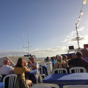 別のツアーのホエールウッチングに参加しなくてもディナークルーズで見れるので十分でした。日が沈むにつれ演奏が始まり夕焼け、星空でムード最高潮へ。踊りだす人やカップルで抱き合ってる人さすが外国、言葉は通じませんが日本ではクジラを眺めながらの食事あじわえない体験をしてきました。
