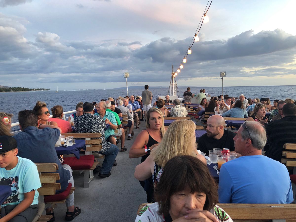 アロハ!!!素晴らしい時間を過ごしました。食べ物も飲み物も良かったです。エンターテイメントも楽しみました。私はドレスにヒールを履いていましたが、それを考えませんでした。女性へのアドバイスとしては...フラットな靴を履くと、ボートの上でより安心感が得られます。この体験を皆にお勧めします。クルーズには子供を含むすべての年齢層がいました。全体的に価格に対して素晴らしい体験でした。
