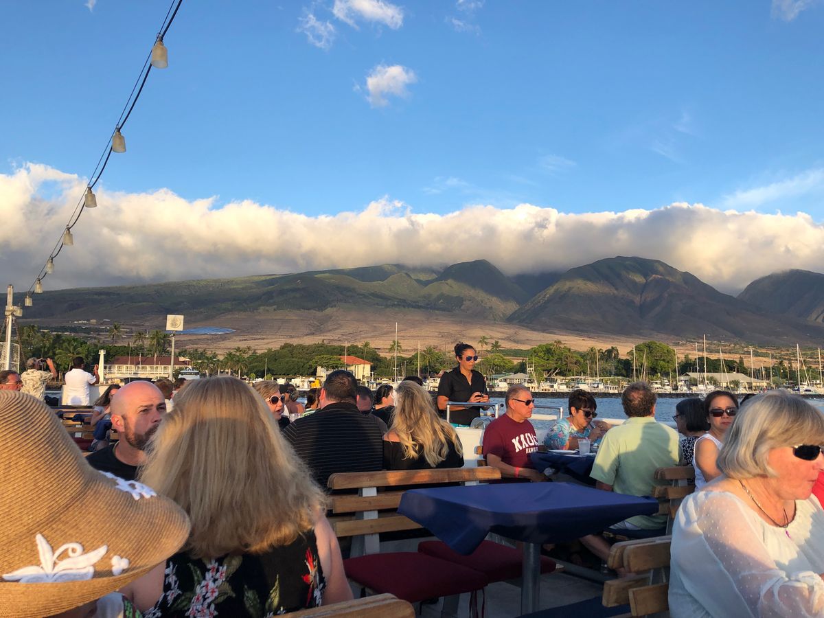 初めてのマウイでしたがこのツアーを見つけて友達夫婦3組6人で参加しました。受付の場所もわかりやすくチェックイン後は席も決まっているので少しラハイナの街を散策できました。船は思ったよりは大きかったので、そんなに揺れませんでした。船からの景色は最高で、特に日が暮れるまでが雄大でとても感動的です。残念ながらサンセットは雲の間でよくわからず。食事はプライムリブを選択、柔らかく美味しかったです。量はもちろん食べきれませんでした。ウェイターの方もフレンドリーで、特にドリンク担当の女性の方は明るく親切でした。いい思い出になりました。