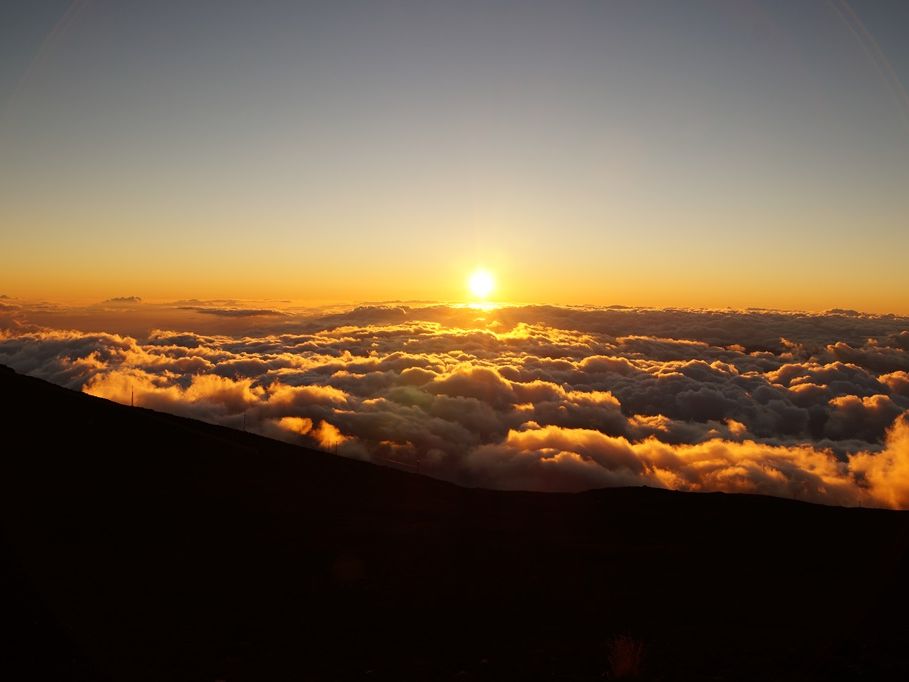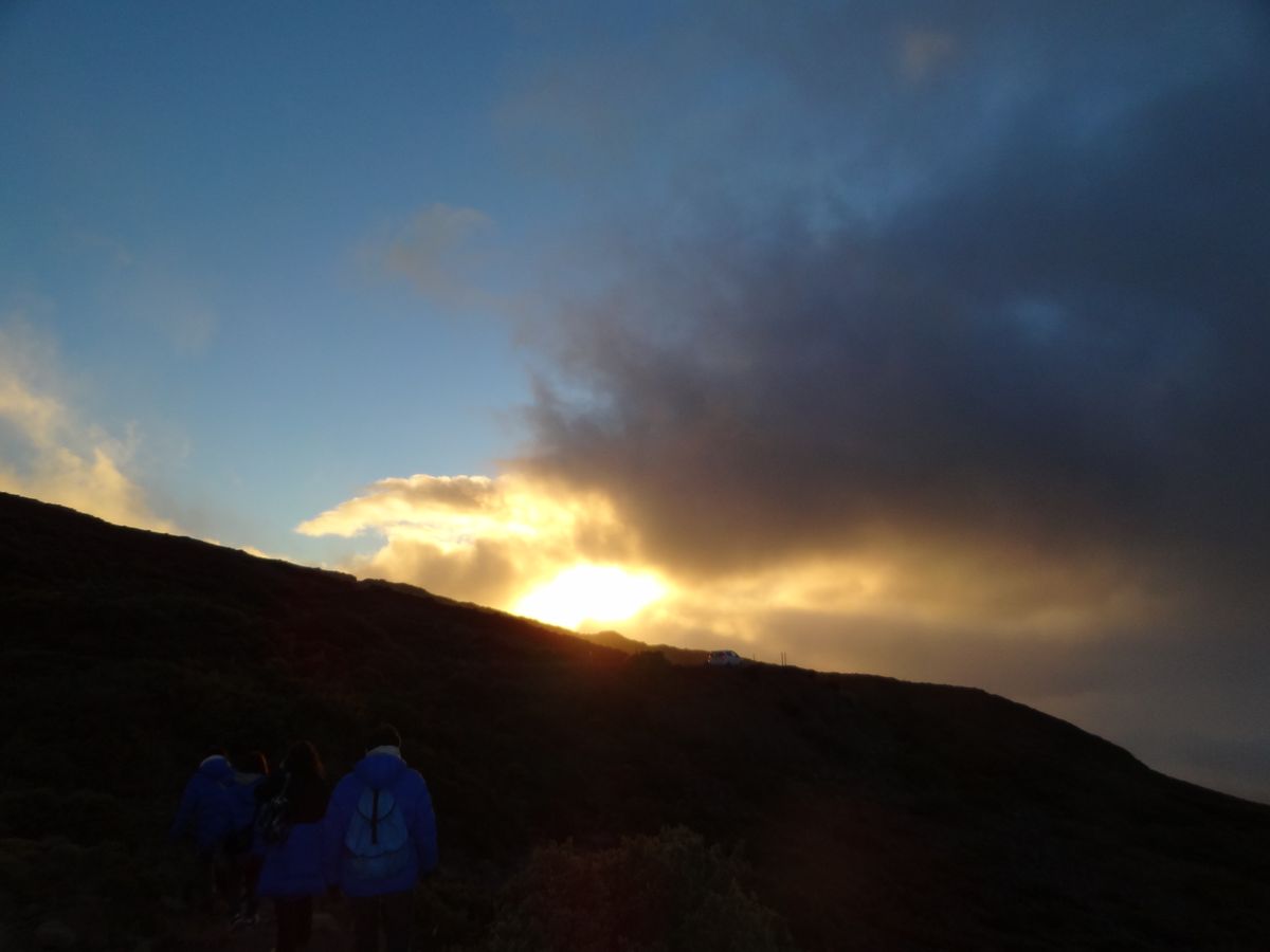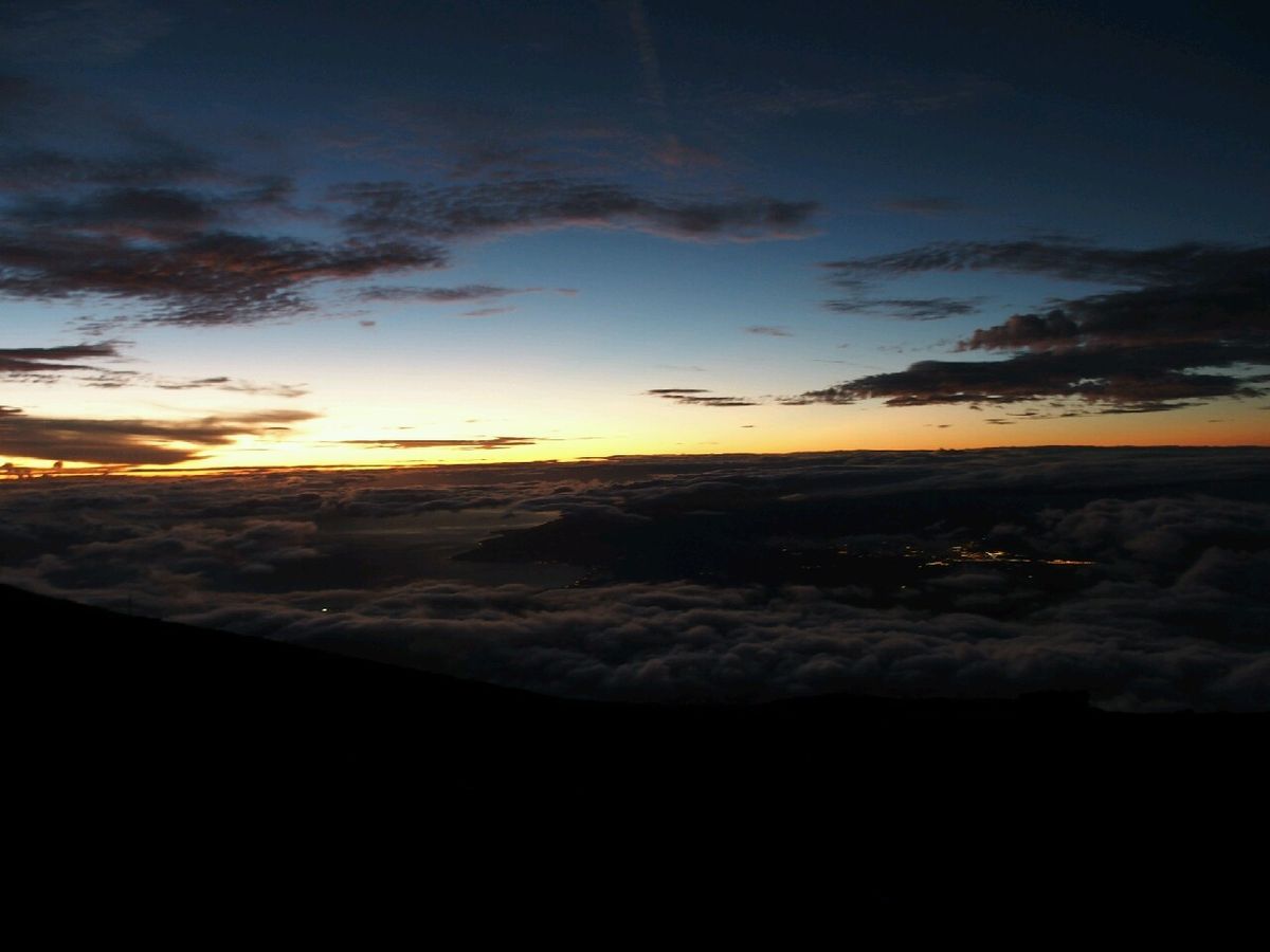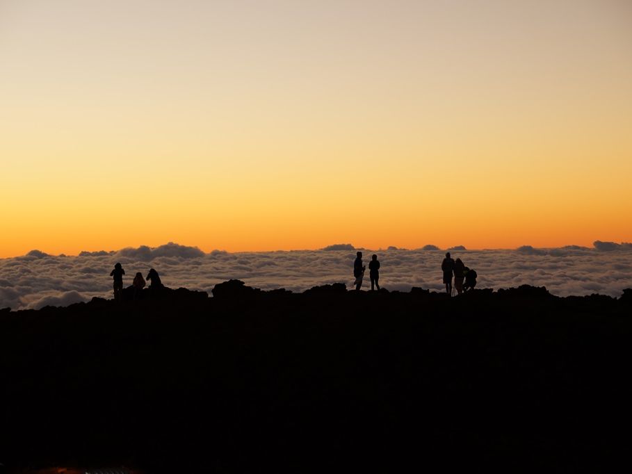 頂上に着いた時には、サンセットにはまだ時間が少しありましたが、ガイドさんの説明を聞きながらスタンバイ。徐々にオレンジ色が強くなり、ついに太陽が雲に隠れてしまいました。マウナケアでは、ハレアカラのほうに日が沈んだので、マウイ島の山に沈むのを想像していたのですが、これはこれで荘厳な趣があってまた格別でした。