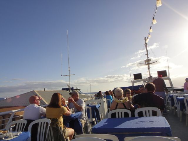 別のツアーのホエールウッチングに参加しなくてもディナークルーズで見れるので十分でした。日が沈むにつれ演奏が始まり夕焼け、星空でムード最高潮へ。踊りだす人やカップルで抱き合ってる人さすが外国、言葉は通じませんが日本ではクジラを眺めながらの食事あじわえない体験をしてきました。